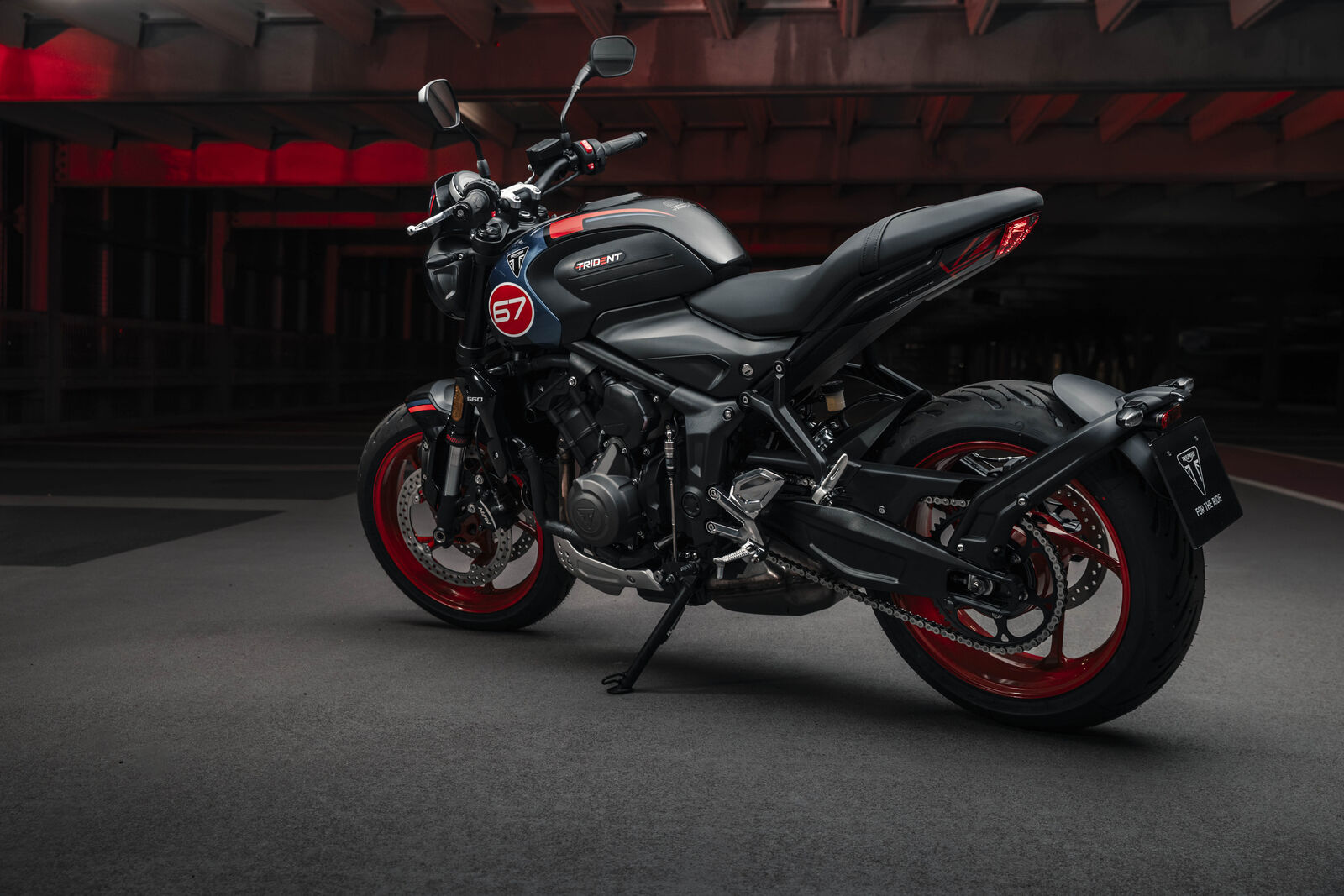 Die Special Edition behält ihr vom Rennsport inspiriertes Aussehen bei und ist eine Hommage an TRIUMPHs legendäres Rennbike „Slippery Sam", mit dem die Marke fünf Mal die TT auf der Isle of Man gewann. Als moderne Hommage an diese Erfolge – und im Kontrast zum letztjährigen Sondermodell – ist das Design des neuen Bikes in glänzendem Sapphire Black gehalten. Im Kontrast dazu stehen die auffälligen Farbakzente in Cobalt Blue und Diablo Red, die sich über den Tank und die Frontpartie ziehen. Mit der Zahl „67" auf dem Tank – der Startnummer von „Slippery Sam" – schlägt TRIUMPH die Brücke zur berühmtesten Trident der Firmengeschichte.