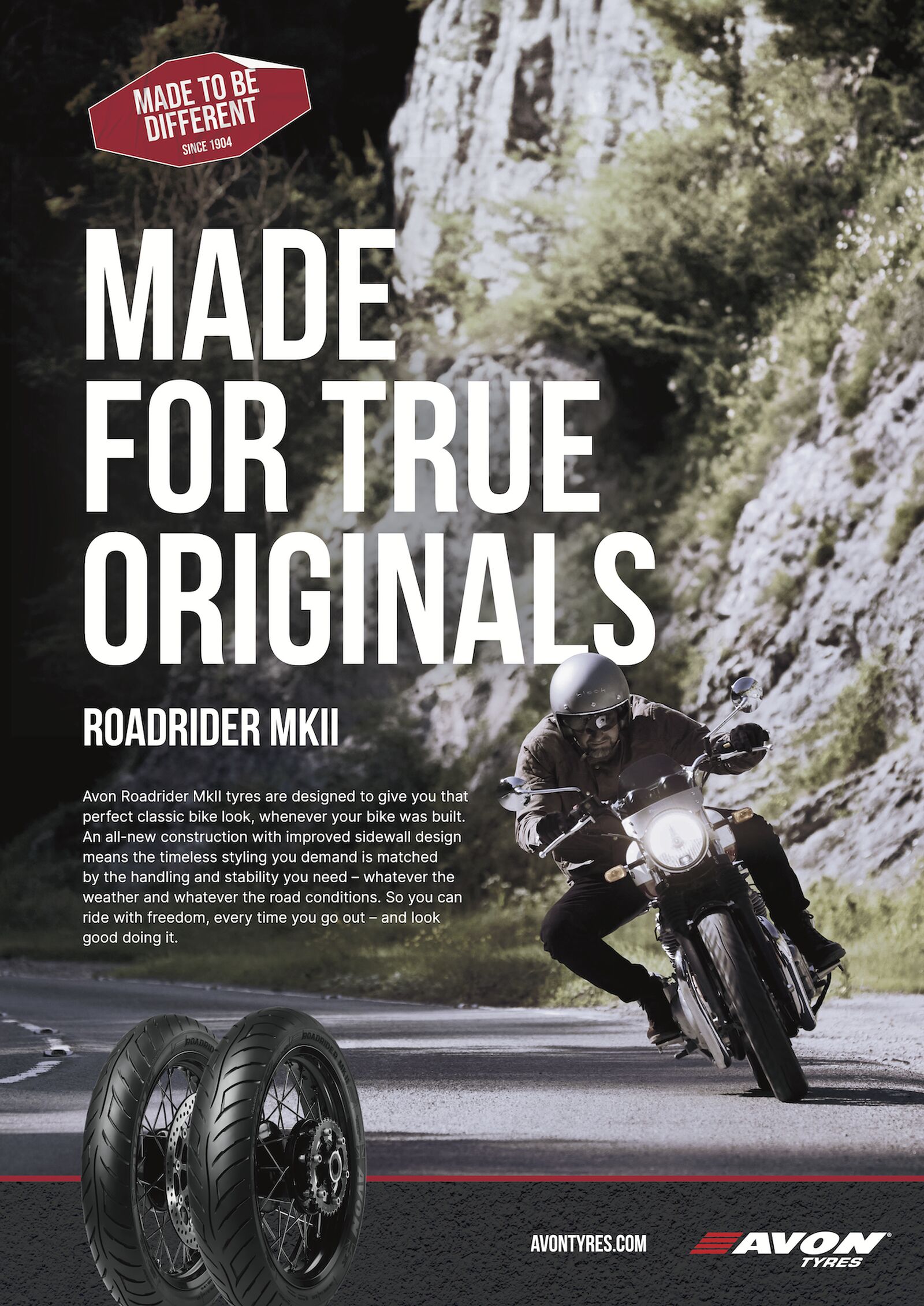 "Made for true originals": Roadrider MkII. Der Roadrider MKII wurde entwickelt, um Motorrädern den perfekten Retro-Look zu verpassen. Aber auch in puncto Performance und Laufleistung weiß der Tourenreifen in Diagonal-Bauweise zu überzeugen. Egal ob Oldtimer, Youngtimer oder moderne Bikes in klassischer Optik - mit dem Roadrider MKII können Biker die Ausfahrt in vollen Zügen genießen. Die Roadrider MKII „Reifenfreigaben" umfassen fast 1100 Modelle.