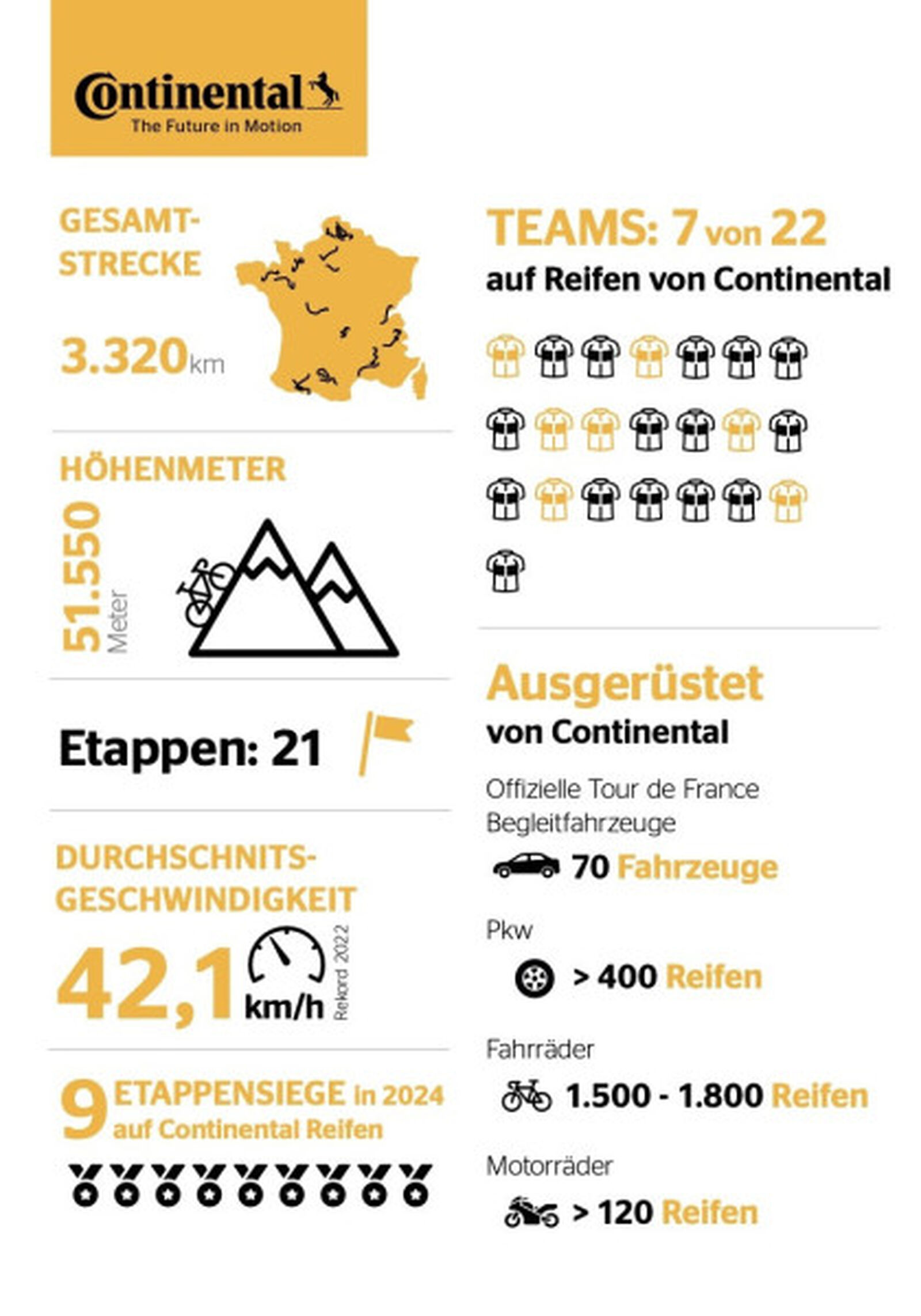 „Die Tour de France ist eine hervorragende Plattform, um die Leistungsfähigkeit und Nachhaltigkeit unserer Produkte einem sportbegeisterten und internationalen Publikum zu präsentieren", sagt Timo Röbbel, Leiter Marketing Reifen-Ersatzgeschäft bei Continental Deutschland. „In diesem Jahr fahren nicht nur sieben Toprennteams auf unseren Reifen, wir rüsten auch mehr als 70 offizielle Begleitfahrzeuge der Tour mit dem UltraContact NXT, unserem bisher nachhaltigsten Autoreifen, aus. So leisten wir einen wichtigen Beitrag zu einer sicheren und umweltfreundlichen Tour."