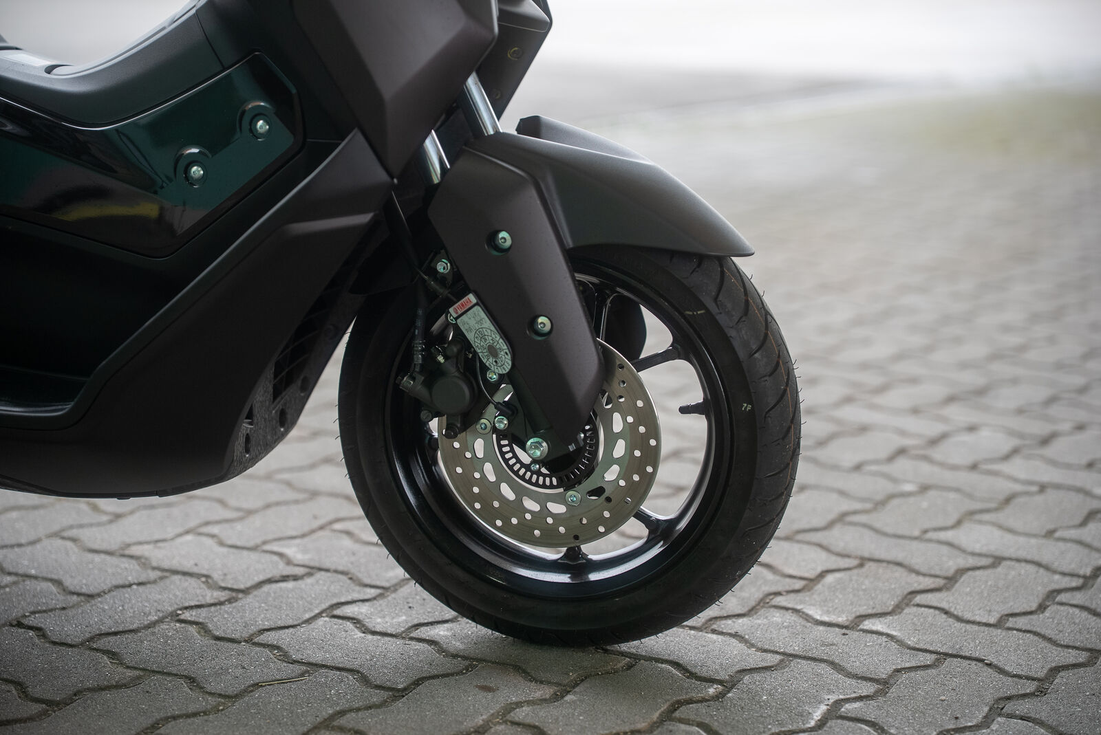 Der NMAX 125 punktet besonders durch sein angenehmes Fahrverhalten. Trotz seines kleinen Motors liefert er genug Leistung, um auch bei höheren Gewichten ordentlich anzuziehen und einen spaßigen Fahrstil zu ermöglichen. Das Fahrwerk ist durch die Telegabel und die Triebsatzschwinge auf Komfort ausgelegt und nimmt Unebenheiten der Straße gut auf. Ein kurzer Radstand von 1340 mm sorgt zusätzlich für Wendigkeit und gute Kontrolle – ideal für die Stadt. Das geringe Gewicht von 132 kg macht den Roller zudem einfach zu handhaben und zu parken. Allerdings ist der NMAX 125 für längere Fahrten auf Landstraßen oder Autobahnen weniger geeignet. Hier fehlt es an Stabilität und Windresistenz, was bei höheren Geschwindigkeiten und längeren Fahrten spürbar wird.