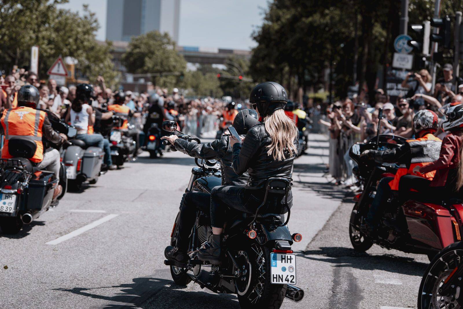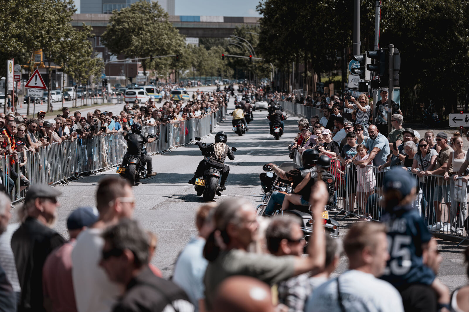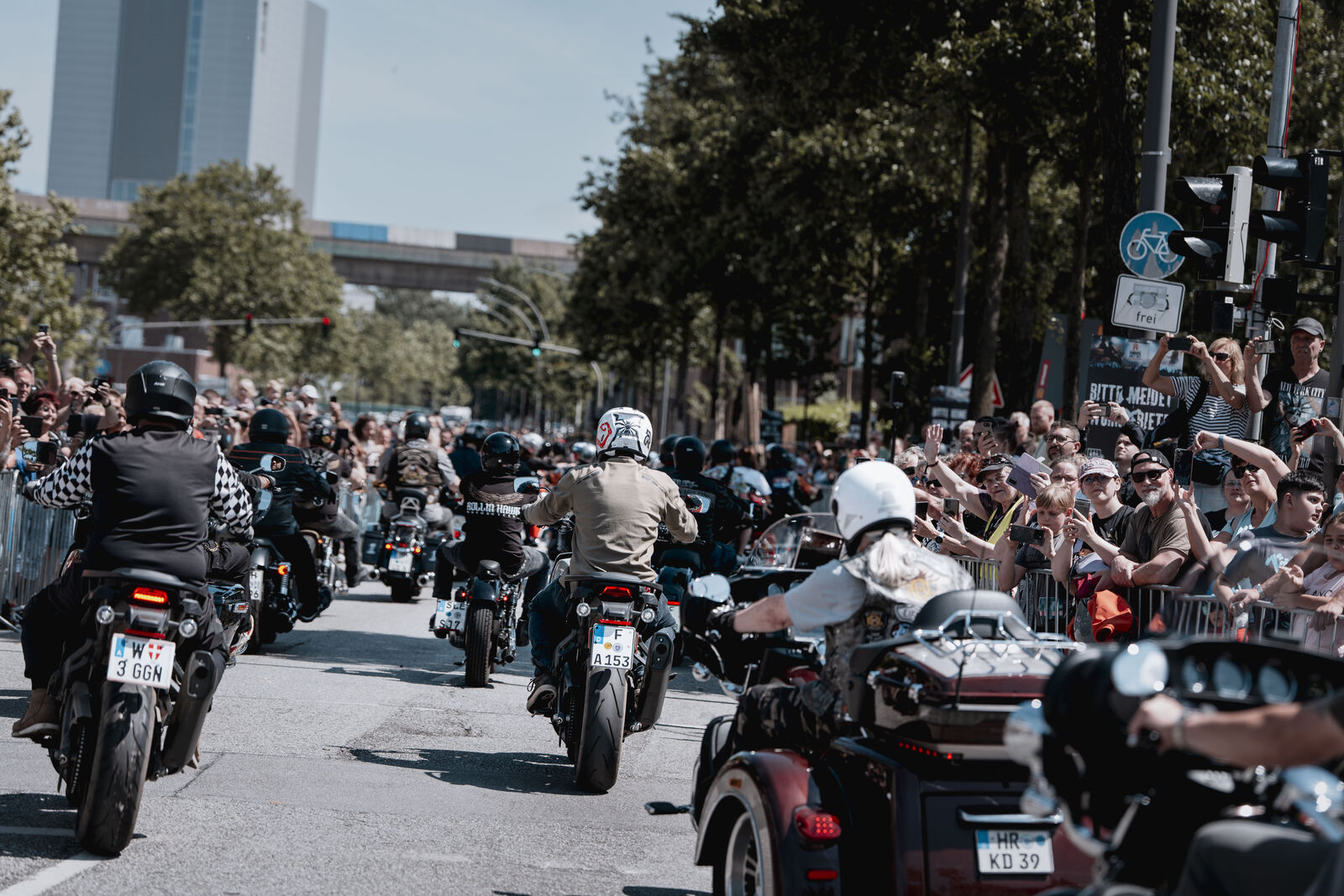 Als ich ankam, war ich sofort von der schieren Menge an Harley Davidson Motorrädern überwältigt. Hinter mir reihte sich eine beeindruckende Anzahl an Maschinen auf, während sich die ersten Teilnehmer bereits auf den Weg machten. Der Klang der Motoren erfüllte die Luft und trug zur festlichen Stimmung bei. Die Parade sollte zwei Stunden durch Hamburg führen und war damit ein echtes Highlight für jeden Motorradliebhaber. Es war erstaunlich zu sehen, wie viele Menschen sich um die Straßen versammelten, um das Spektakel zu beobachten. Ob jung oder alt – die Begeisterung war überall spürbar. Die Straßen waren gesperrt, und es fühlte sich an, als würde die gesamte Stadt für dieses Event leben.