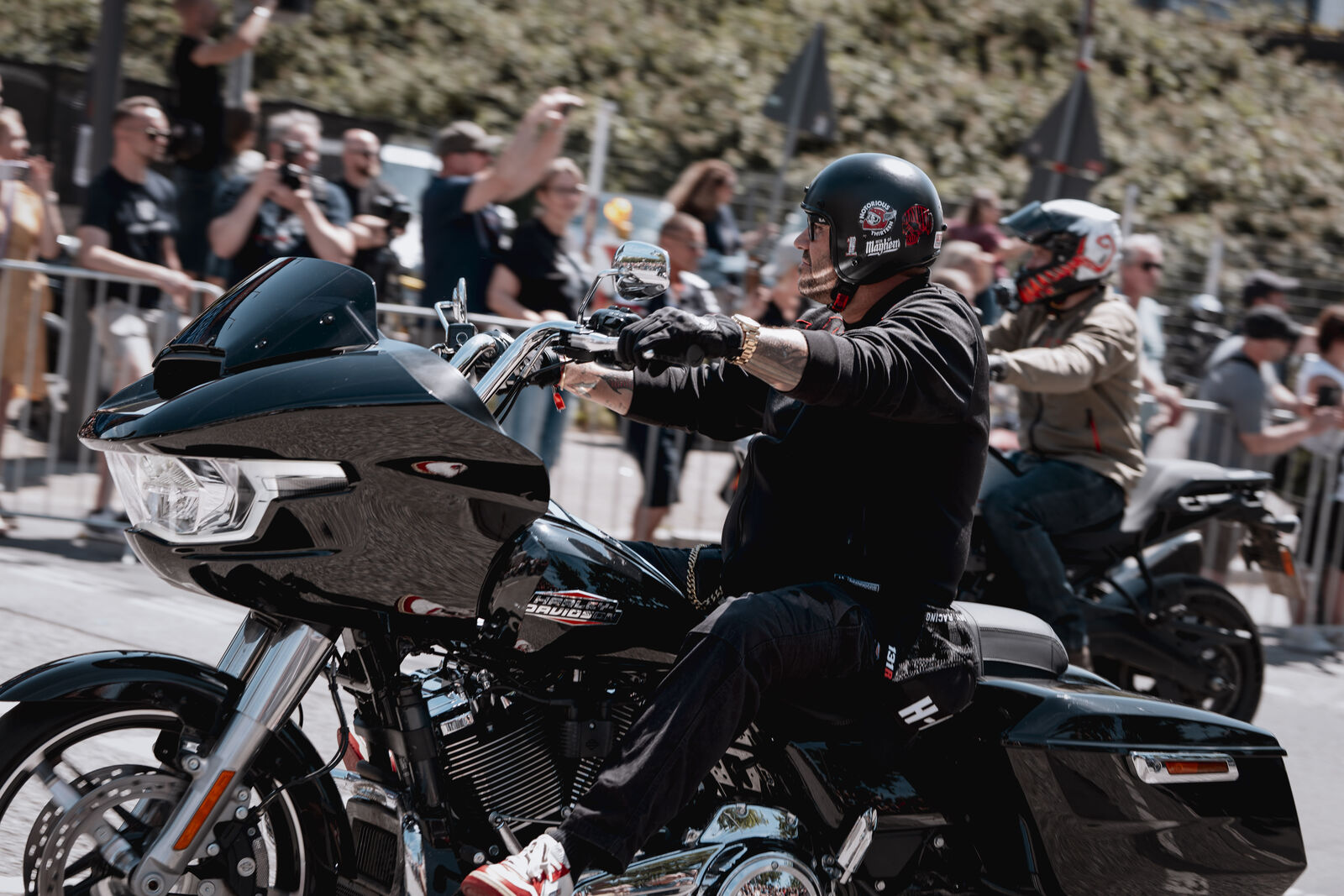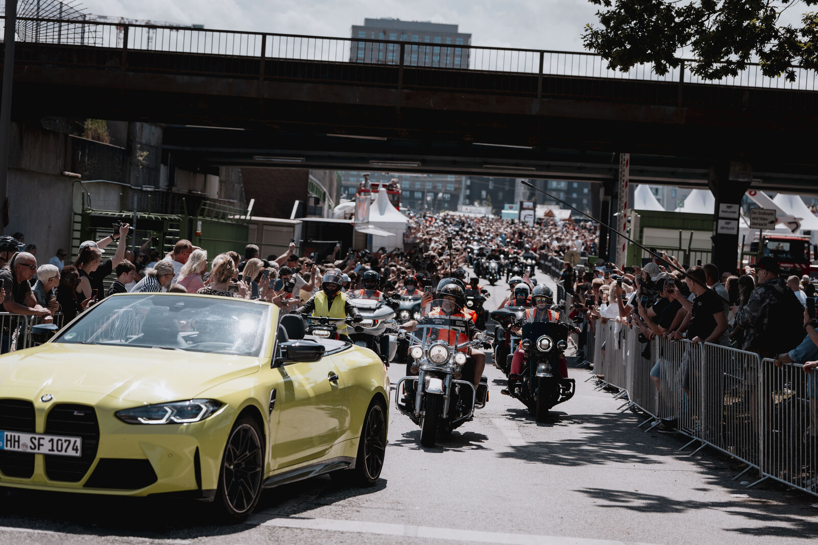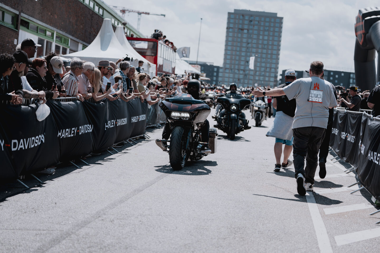 Als ich ankam, war ich sofort von der schieren Menge an Harley Davidson Motorrädern überwältigt. Hinter mir reihte sich eine beeindruckende Anzahl an Maschinen auf, während sich die ersten Teilnehmer bereits auf den Weg machten. Der Klang der Motoren erfüllte die Luft und trug zur festlichen Stimmung bei. Die Parade sollte zwei Stunden durch Hamburg führen und war damit ein echtes Highlight für jeden Motorradliebhaber. Es war erstaunlich zu sehen, wie viele Menschen sich um die Straßen versammelten, um das Spektakel zu beobachten. Ob jung oder alt – die Begeisterung war überall spürbar. Die Straßen waren gesperrt, und es fühlte sich an, als würde die gesamte Stadt für dieses Event leben.