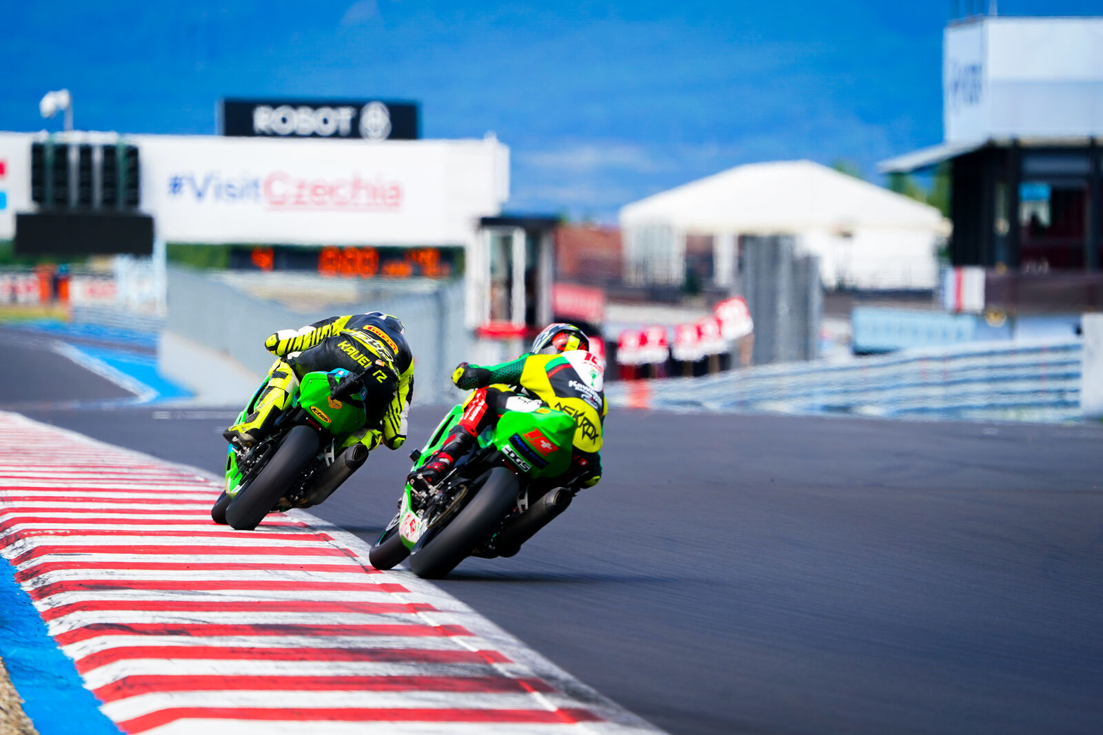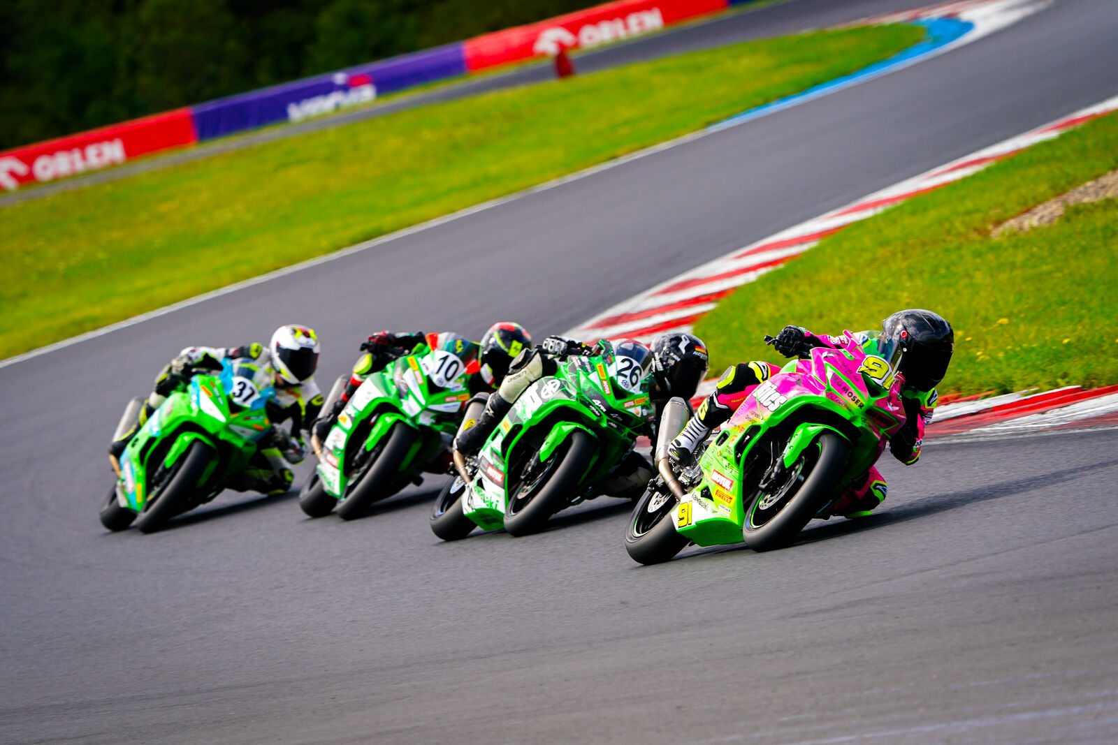 Der vierte Lauf des Kawasaki ZX-4RR Cups im tschechischen Most bot packende Rennen bei wechselhaftem Wetter. Nachdem starker Regen die Trainingsbedingungen erschwerte, sicherte sich Ben Wiegner (#26) im ersten Qualifying die Pole Position. Das zweite Qualifying fiel aufgrund von Dauerregen aus, sodass das Ergebnis von Q1 maßgeblich war. In Rennen 1 zeigte Wiegner seine Dominanz, baute seinen Vorsprung aus und pulverisierte den Rundenrekord, während Felix Kauertz (#37) trotz Schulterverletzung den zweiten Platz hielt. Aaron Thomas Müller (#10) vervollständigte das Podium. In Rennen 2 kämpfte Wiegner erneut an der Spitze, doch Kauertz setzte sich im Foto-Finish um Platz zwei durch. Niklas Böhlen landete auf Rang drei, während der Kampf um Rang sechs erneut an Luna Köckritz ging. Mit zwei Siegen hat Wiegner den Rückstand auf Kauertz auf nur sechs Punkte verkürzt. Der Kampf um den Titel bleibt spannend, da mit Assen und dem Nürburgring noch zwei Rennen bevorstehen.