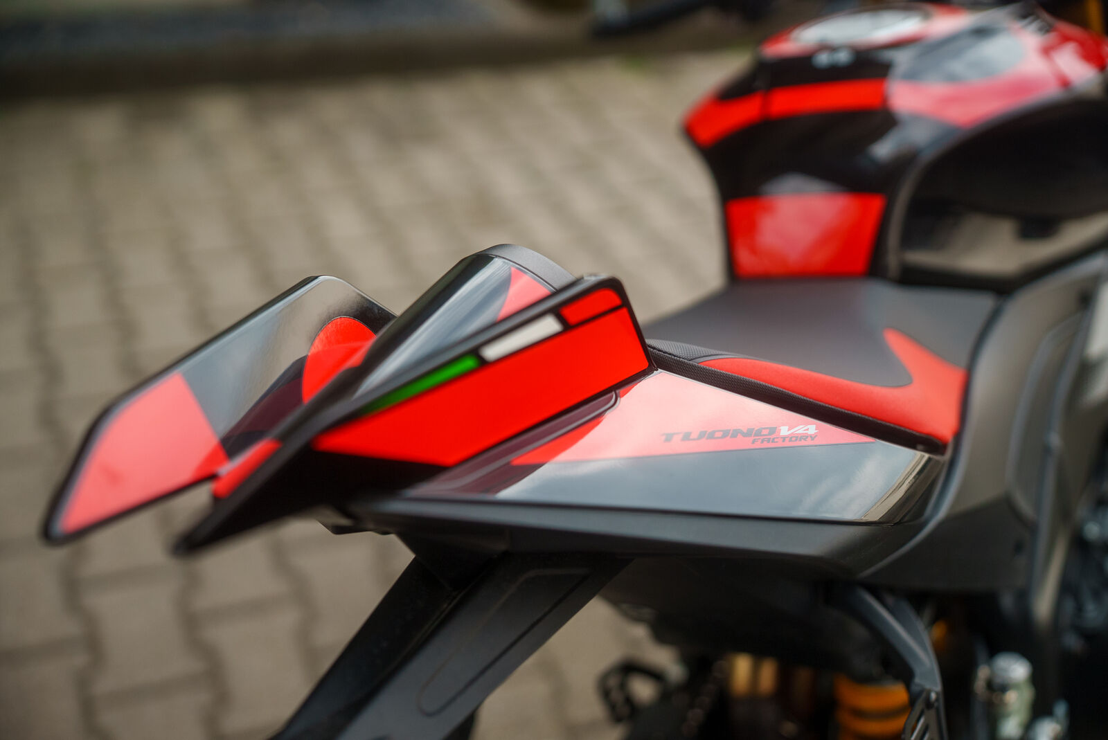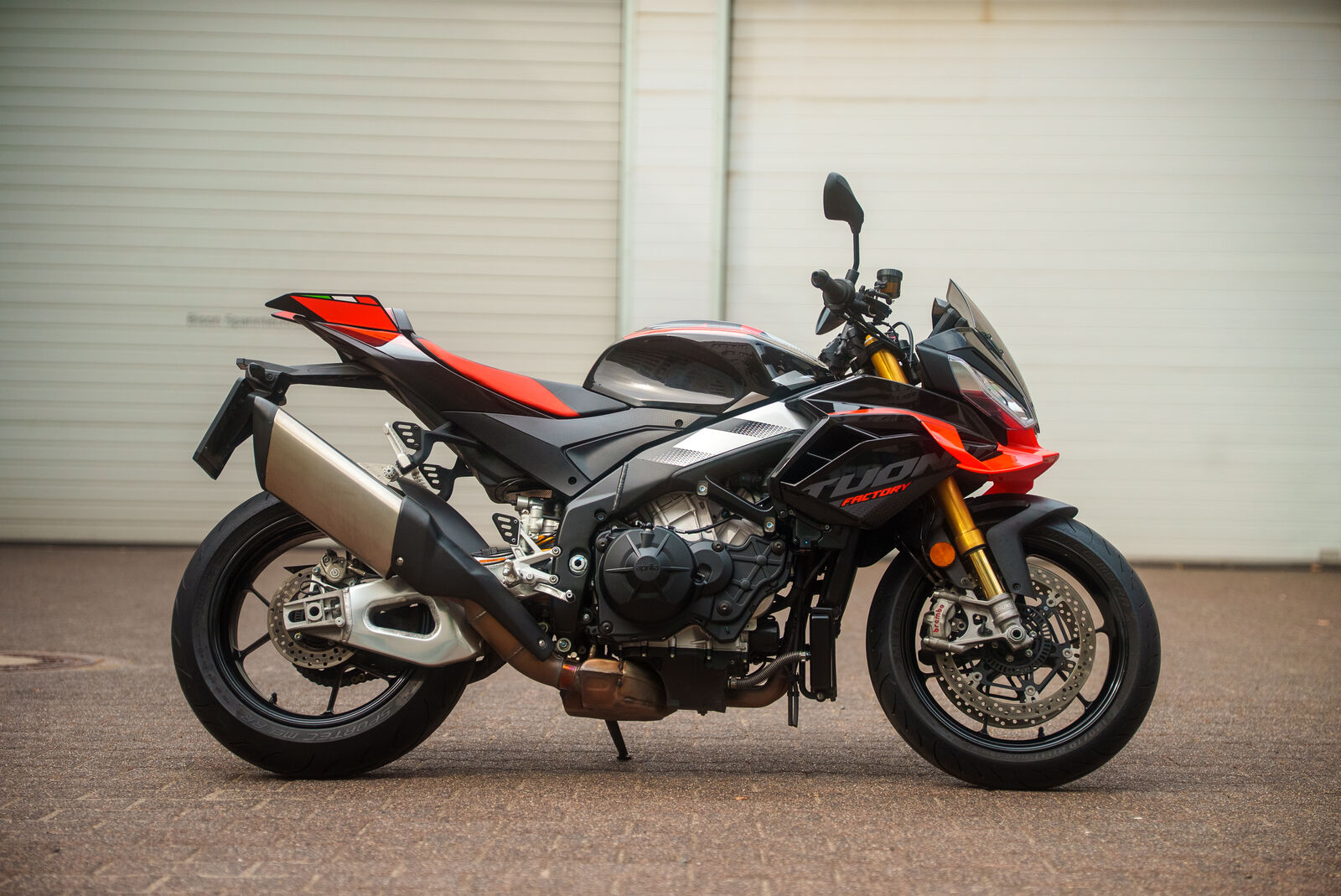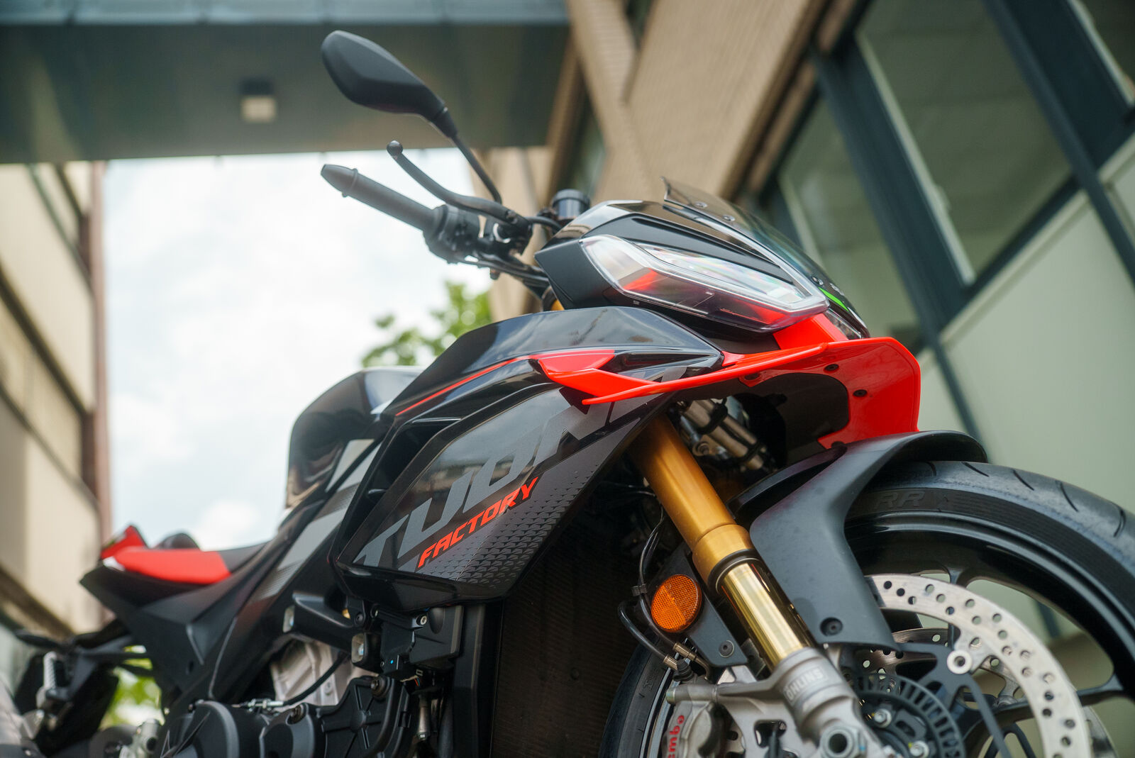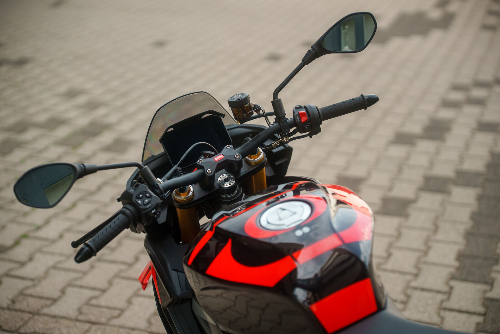 Was mich richtig überrascht, ist das Fahrwerk der Tuono. Das elektronische Fahrwerk bügelt fast jede Unebenheit glatt. In der Stadt, wo der Asphalt oft schlecht ist, merkt man das besonders stark – die Tuono macht jede Schlaglochpassage mit einer Leichtigkeit, die ich bei anderen Motorrädern oft vermisse. Das ist wirklich beeindruckend, vor allem, weil ich nicht erwartet habe, dass so ein sportliches Bike so komfortabel fahren kann. Du fühlst dich fast, als würdest du über den Asphalt gleiten, so gut wird jede Unebenheit weggebügelt. Ich bin die Strecke heute mit mehreren Motorrädern gefahren, aber keine hat so gut abgeschnitten, was das Handling und den Komfort in der Stadt betrifft. Es fühlt sich fast an, als ob die Tuono für die Stadt gemacht wurde – dabei ist sie doch eigentlich ein starkes Naked Bike mit Rennsportgenen. Das Fahrwerk passt sich super an die Umgebung an und macht die Fahrt in der Stadt echt angenehm, was ich so nicht erwartet hätte.