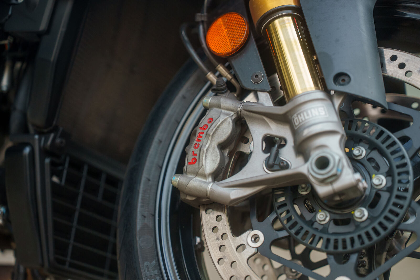 Der Motor ist einer der stärksten, die du auf dem Markt kriegen kannst. Klar, heute geht es erstmal nur um eine erste Fahrt, nicht um Highspeed auf der Landstraße. Aber schon beim ersten Fahren merke ich, wie gut der Motor bei niedrigen Drehzahlen läuft. Bei 3000 Umdrehungen zieht er sauber, ohne zu stottern, und auch in mittleren Drehzahlen geht er richtig gut. Es ist schon richtig geil, wie der Motor in der Stadt funktioniert, besonders wenn man einfach so eine entspannte Runde dreht. Was mich allerdings stört, ist die Kupplung – die ist echt schwergängig. Im Stadtverkehr nervt das ein bisschen, vor allem wenn man häufig in den Leerlauf schaltet. Bei der Moto Guzzi Stelvio haben sie es mit einer Brembo-Hydraulikkupplung geschafft, warum haben sie das hier nicht gemacht? Trotzdem, die Gasanahme ist fast perfekt – super fein dosierbar und unglaublich weich, was mir echt Spaß macht. Und der Quickshifter – der funktioniert jetzt schon butterweich. Du merkst richtig, wie gut das Motorrad für den Rennsport gemacht ist, es ist einfach extrem präzise.