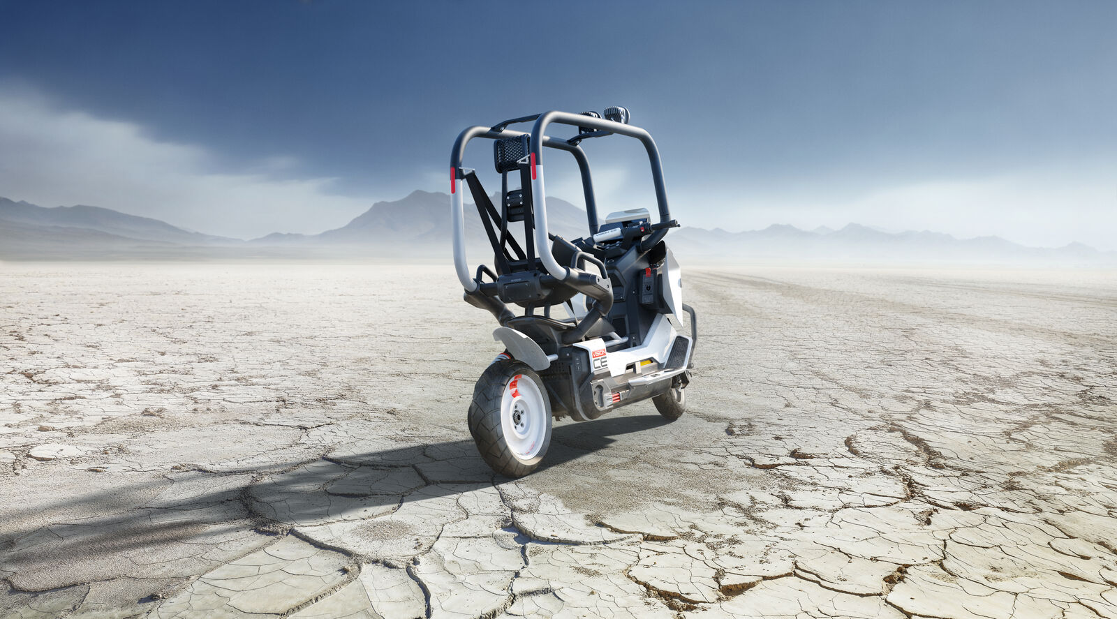 Die reduzierte Bauhöhe des Cage und dessen offene und luftige Konstruktion lassen den Vision CE in Verbindung mit einem langen Radstand gestreckt, dynamisch und optisch leicht wirken. Der offene Einsatz von beschichtetem Aluminium setzt exklusive technische Akzente. Die Grundfarbe Matt-Weiß lässt den Vision CE in Verbindung mit der Kontrastfarbe Schwarz klar, reduziert und skulptural erscheinen. Ergänzt wird die innovative Form- und Farbensprache von einer Sitzbank in edlem Mattglanz mit integriertem Schriftzug sowie von neonroten Akzenten, etwa bei den Grafiken und besonders hervorgehobenen Details. Ein weiteres Highlight des Vision CE ist die Balancierfunktion, die es dem Fahrzeug ermöglicht, sich im Stand vollständig selbst auszubalancieren. Der BMW Motorrad Vision CE definiert urbanen Fahrspaß auf zwei Rädern völlig neu – dank der einzigartigen Cage-Konstruktion ohne Helmpflicht und ohne die Notwendigkeit von Motorradbekleidung. Mit den unterschiedlich gestalteten Derivaten unterstreicht BMW Motorrad die Wandlungsfähigkeit dieses Visionsfahrzeuges.