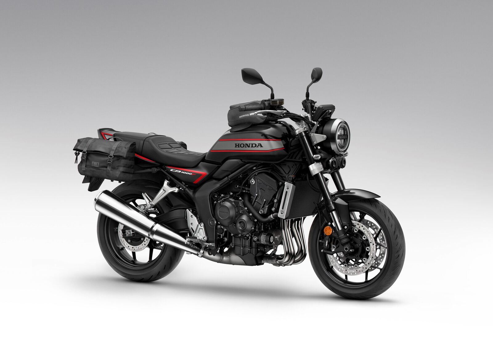 Im Bereich Elektronik setzt Honda auf ein modernes Paket mit Sechsachsen-Gyrosensorik, elektronischem Gasgriff und drei vorkonfigurierten Fahrmodi (Sport, Standard, Rain) sowie zwei individuell programmierbaren User-Modi. Jeder Modus beeinflusst Parameter wie Motorleistung, Motorbremse und HSTC-Traktionskontrolle inklusive Wheelie-Control – einsetzbar in drei Stufen. Besonders clever: Die Sensorik passt die Eingriffe in Echtzeit an die Fahrdynamik an. Die CB1000F bringt somit nicht nur Performance, sondern auch ein hohes Maß an Fahrassistenz für mehr Sicherheit. Der Motor wurde auf niedrige bis mittlere Drehzahlen abgestimmt, mit verlängerter Ansaugtrichterlänge und geänderten Kanal-Durchmessern für ein pulsierendes Ansauggeräusch und linearen Schub. Der optimierte Auspuff unterstützt den sportlichen Sound, während das Getriebe kürzere Übersetzungen für die unteren Gänge und längere für den entspannten Reisetempo-Bereich bietet – perfekt abgestimmt für ein ausgewogenes Fahrgefühl.
