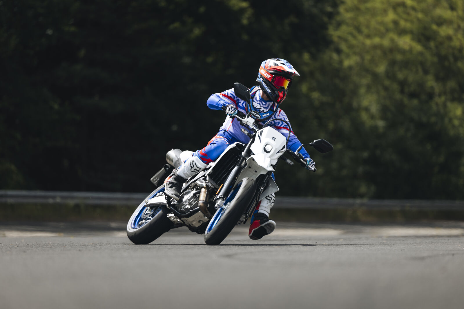 Im Training zeigt die DR-Z4SM ihre Stärken besonders deutlich. Die vorderradorientierte Sitzposition erleichtert aggressives Einlenken, das sportliche Fahrwerk vermittelt exakt, was unter dem Fahrer passiert, und die kontrollierbare Leistung ermöglicht schnelle Fortschritte, ohne Einsteiger zu überfordern. Durch das leichte Handling und das ABS-Off hinten lässt sich das Hinterrad gezielt entlasten und in Bewegung bringen. Für A2-Fahrer ist die DR-Z4SM ein ideales Werkzeug, um Fahrphysik nicht nur zu hören, sondern wirklich zu spüren.