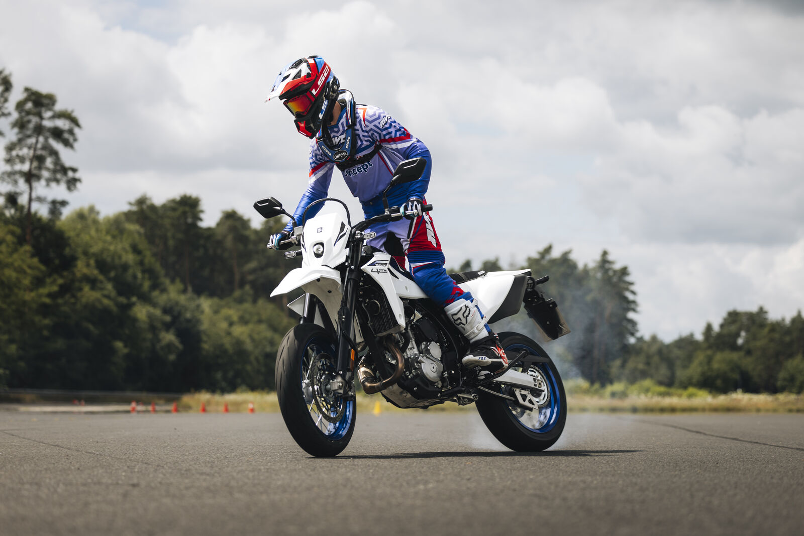 Die Suzuki DR-Z4SM ist wie gemacht für Supermoto-Fahrtechnik. Mit ihrem 38-PS-Einzylinder, dem leichten Handling und dem präzisen Fahrwerk bietet sie ideale Voraussetzungen, um neue Techniken schnell zu verinnerlichen. Besonders wichtig: Das ABS am Hinterrad lässt sich deaktivieren – ein entscheidendes Feature für echte Supermoto-Manöver wie kontrolliertes Sliding. Die Kombination aus 310-mm-Bremsscheibe, radial montiertem Bremssattel und langen Federwegen sorgt für klare Rückmeldung und hohe Stabilität. Dazu kommen drei Fahrmodi, Straßenhomologation und robuste japanische Technik. Ein Bike, das Fehler ehrlich zeigt, aber nie überfordert.
