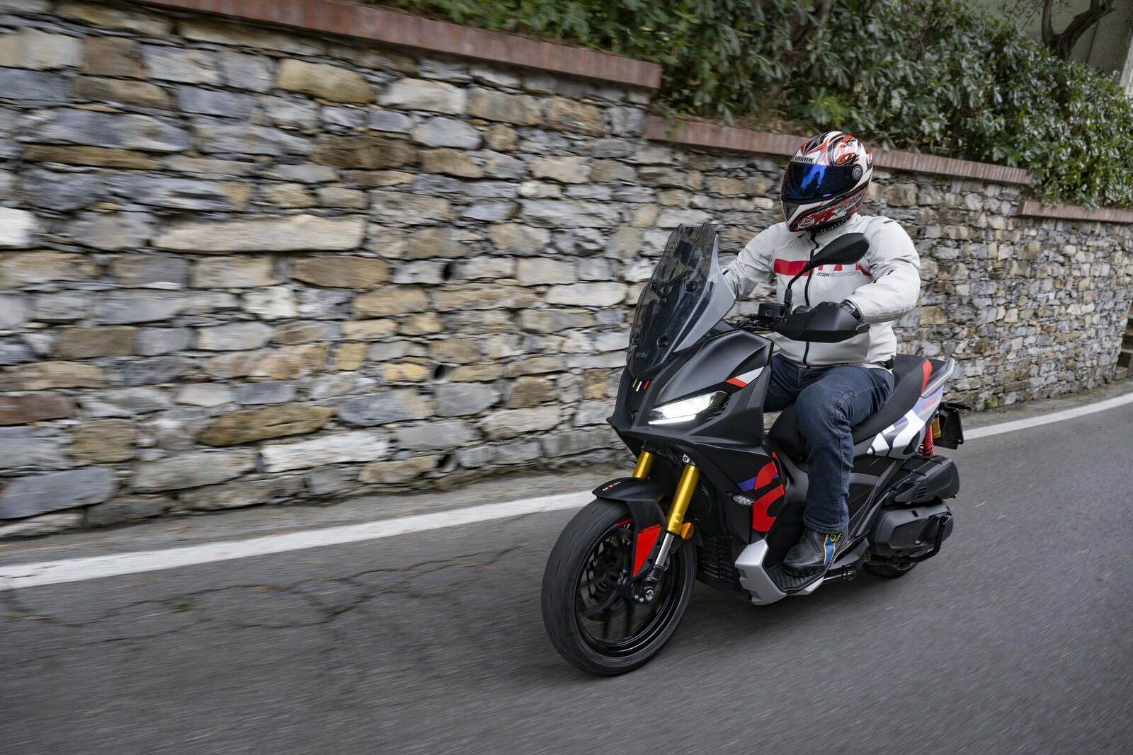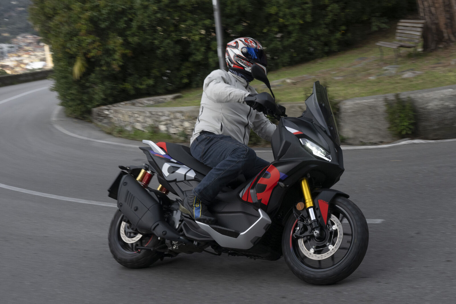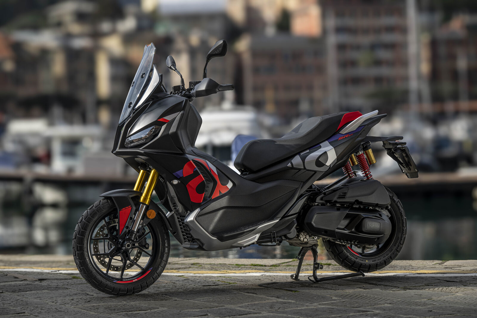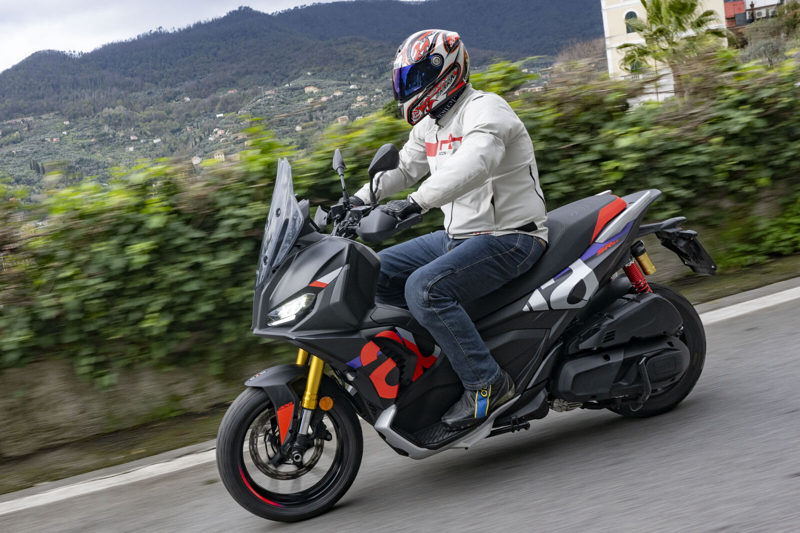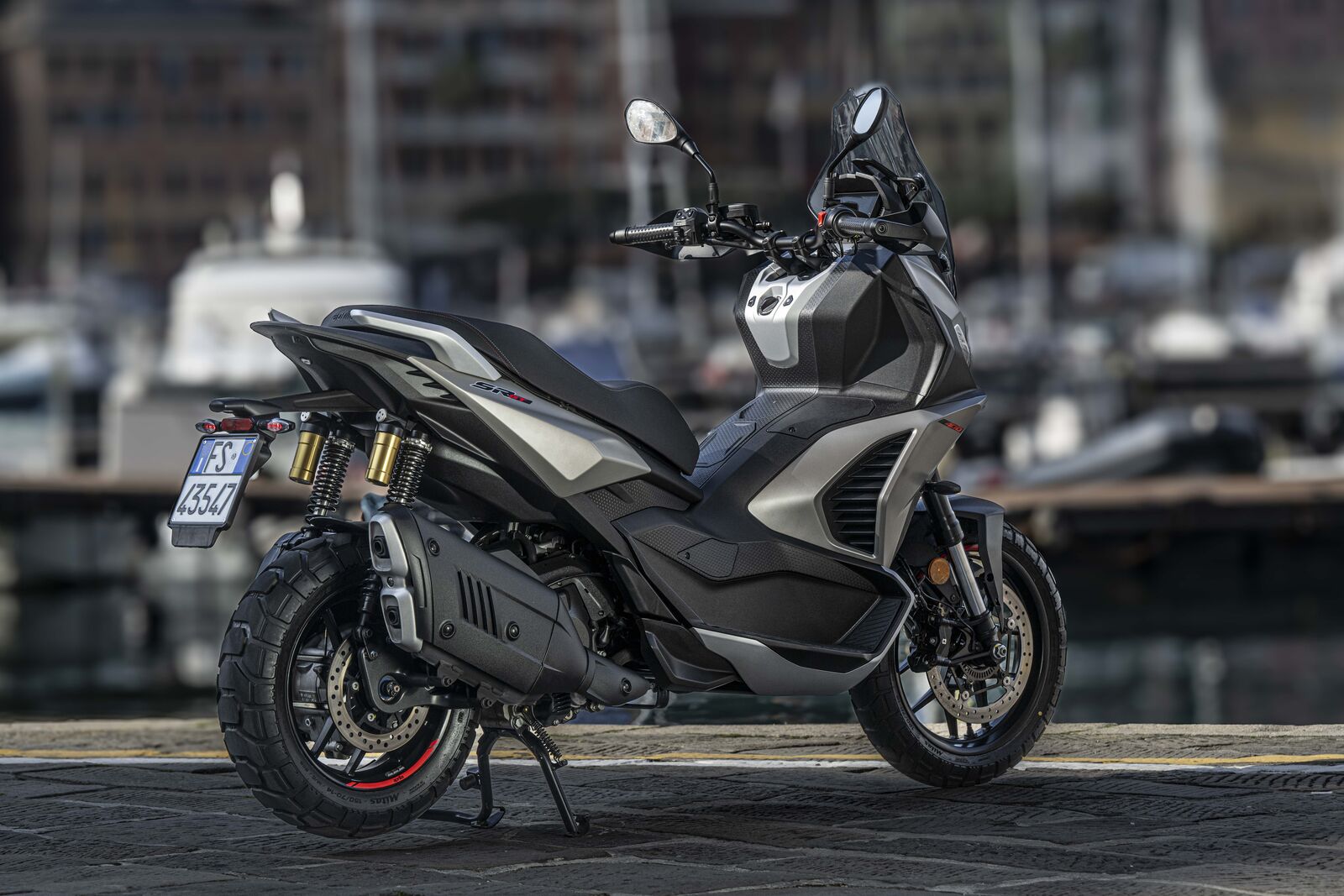 Die Sitzposition macht den Unterschied: weit vorne liegender Lenker, sportliche Haltung und flexible Fußablage erlauben eine komfortable Fahrt auf Asphalt, Schotter oder leichtem Gelände. Der 399-Kubik-Motor liefert 36 PS bei 7.500 U/min und 37,7 Newtonmeter bei 5.700 U/min – genug Power für flotte Stadtausflüge, ohne den Fahrer zu überfordern. Der Gasgriff hat ein leichtes Spiel, lässt sich aber nachjustieren, um das Fahrgefühl zu optimieren. Besonders in den kurvigen Straßen rund um Portofino überzeugte der SR GT: Traktion, Handling und Sicherheit bleiben selbst bei Regen zuverlässig. Die Bremsanlage mit 300-mm-Einzelscheibe und radial montiertem Vierkolben-Sattel arbeitet sanft, zupackend und sportlich zugleich, während das verstellbare Windschild für Komfort auch bei stürmischem Wetter sorgt.