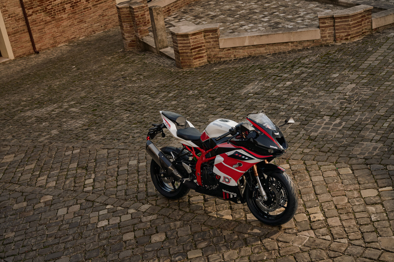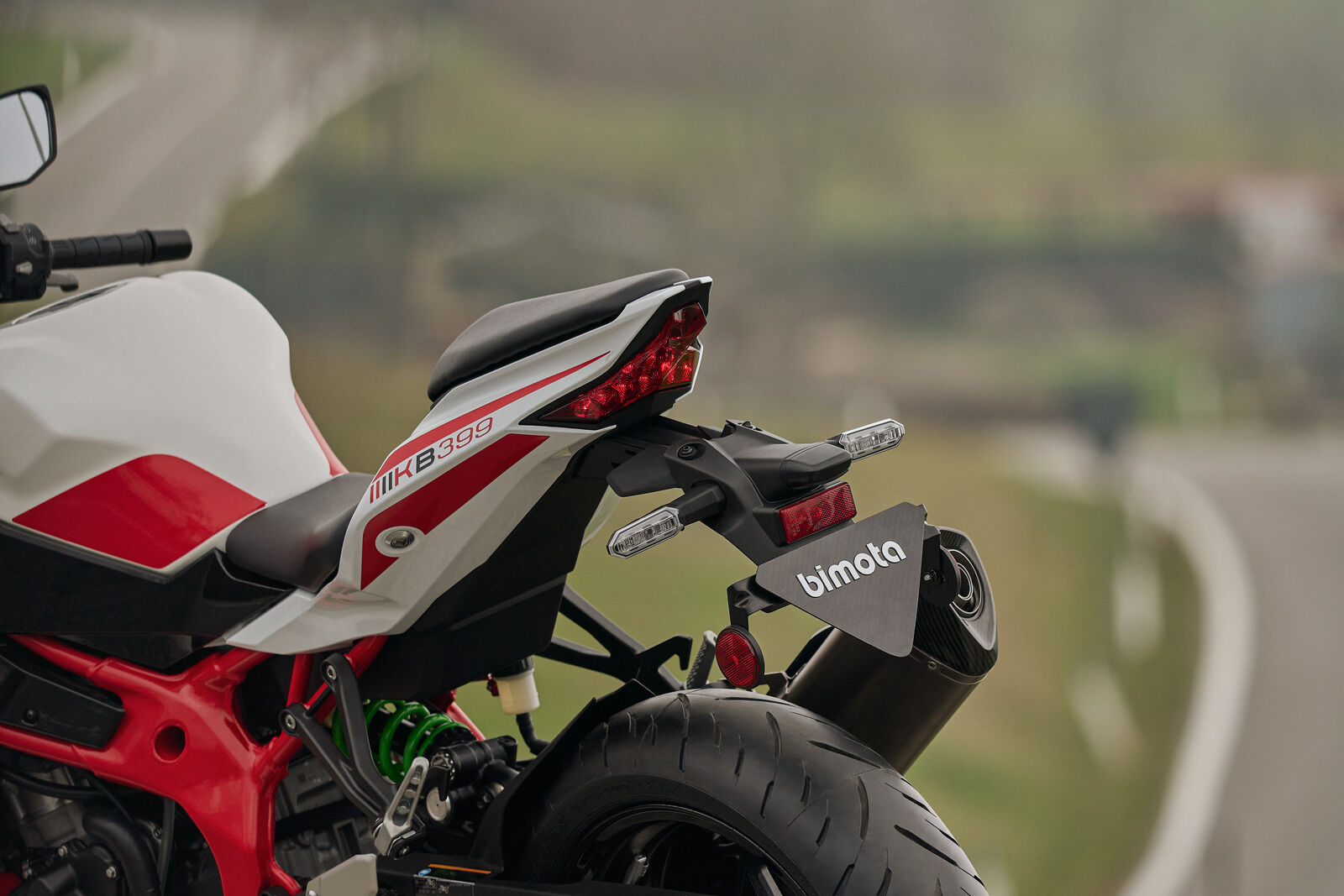 Auf der Straße – und vor allem auf der Rennstrecke – entfaltet die KB399 ihr wahres Potenzial. Die Kombination aus einer 41-mm-Showa-SFF-BP-Gabel und einem Showa-BFRC-lite-Federbein sorgt für messerscharfe Rückmeldung, während die ES-Version mit einem Öhlins STX46 noch einen draufsetzt. Bremsseitig vertraut bimota auf radial montierte Brembo-Stylema-Sättel, die kompromisslose Verzögerung garantieren. Der Sound des Motors, verstärkt durch eine maßgeschneiderte Akrapovič-Anlage, liefert die passende akustische Untermalung. Elektronisch ist alles an Bord, was moderne Performance verlangt: Traktionskontrolle, verschiedene Leistungsmodi, integrierte Fahrprogramme und ein Quickshifter serienmäßig. Das Ergebnis ist ein Motorrad, das nicht nur schnell ist, sondern sich auch jederzeit präzise und kontrollierbar anfühlt.