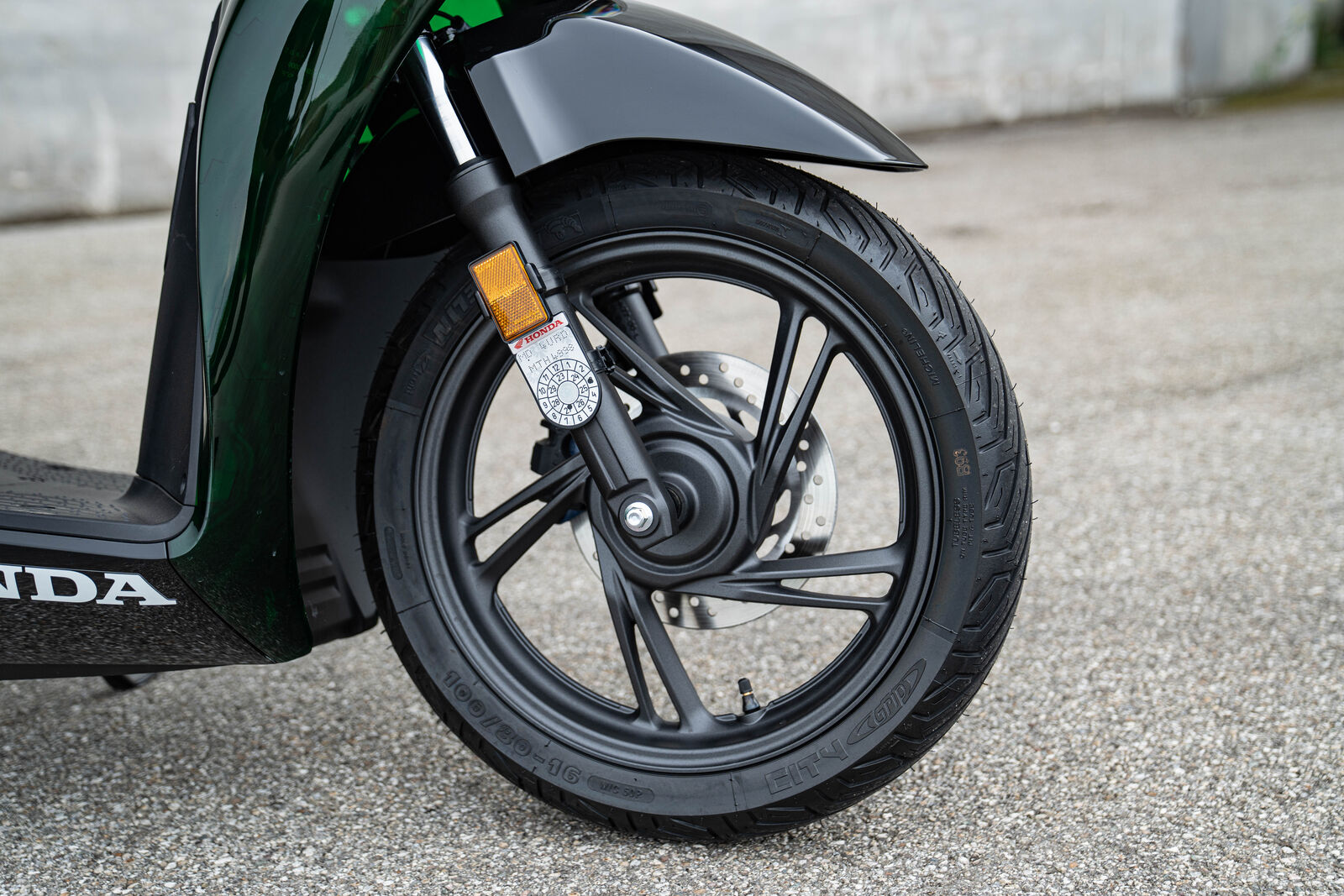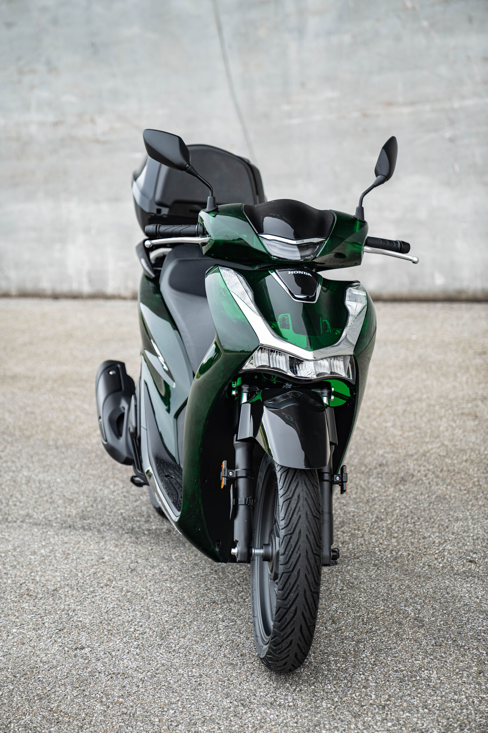 Willkommen im Walkaround! Der SH 125 hat definitiv Style. Die neue Sonderedition kommt mit einer durchsichtigen Optik, die einzigartig ist. Der Roller hat eine grüne Farbe, zwei Stereo-Federbeine hinten und eine Teleskopgabel vorne. Sowohl vorne als auch hinten sind 16-Zoll-Räder verbaut, die mit Michelin-Reifen bestückt sind. Die Optik des SH 125 ist wirklich einzigartig. Der Roller ist mit einem Keyless-Go-System ausgestattet, das den Tank und andere Funktionen elektronisch öffnet. Der Sitz ist groß genug für einen Helm und bietet viel Stauraum. In Österreich kommt der Roller serienmäßig mit einem Topcase. Weitere wichtige Features sind die Start-Stopp-Automatik und eine Traktionskontrolle, die sich auch ausschalten lässt. Der SH 125 ist mit ABS und Scheibenbremsen vorne und hinten ausgestattet. Die Sitzhöhe beträgt 799 mm und ist für alle Fahrergrößen geeignet. Die 16-Zoll-Räder sorgen für eine dynamische Fahrweise und schlucken auch Schlaglöcher problemlos. Der Funfaktor bei diesem Roller liegt in der dynamischen Abstimmung und nicht in der Motorleistung. Die 16-Zoll-Räder machen ihn wendig und spritzig, besonders in der Stadt.