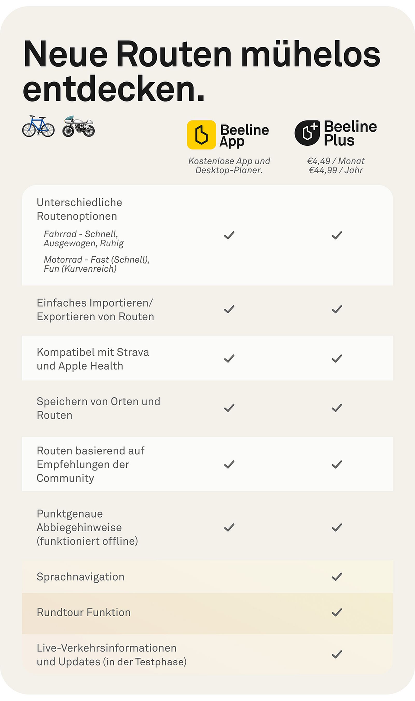 Beeline Plus wird in zwei Abo-Varianten angeboten: einem monatlichen Abonnement für EUR 4,49/CHF 4,40 ohne Vertragsbindung, und einem Jahresabonnement für EUR 44,99/CHF 44, das drei kostenlose Monate inklusive Probemonat bietet. Interessierte können die Premiumstufe einen Monat kostenlos testen und das Abo jederzeit kündigen.
