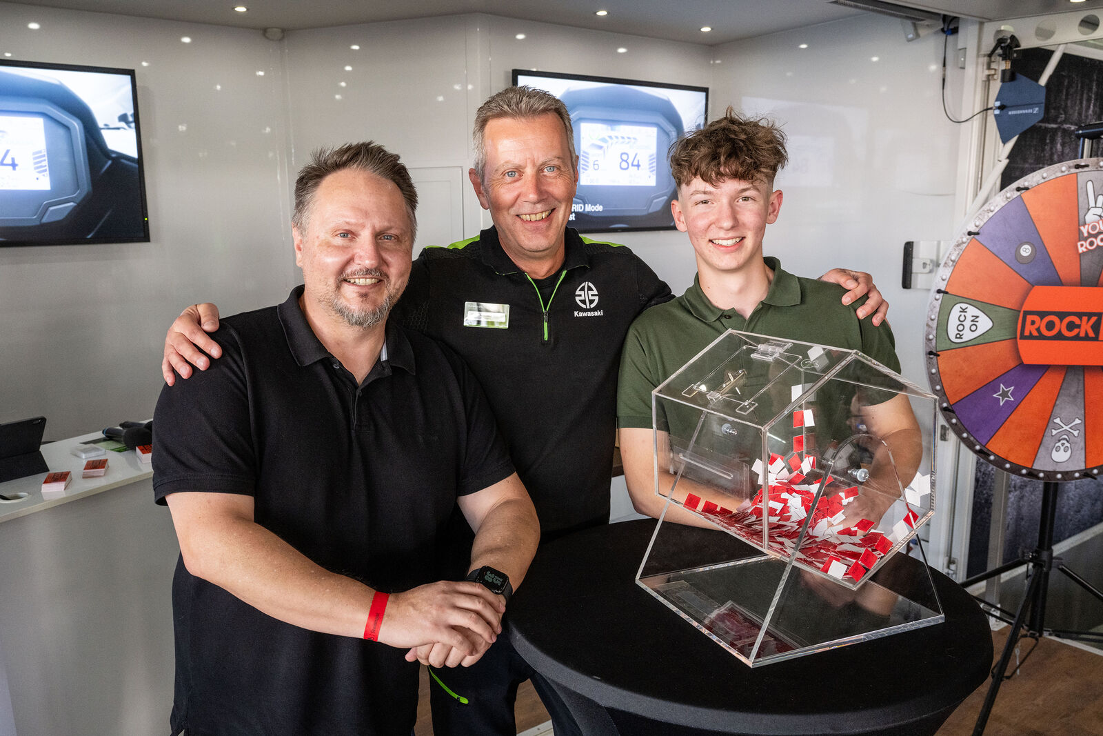 Das absolute Highlight an beiden Tagen stellte jedoch das große Gewinnspiel zum Ninja-Jubiläum dar. Jeder Besucher konnte sich kostenlos ein Teilnahmebändchen abholen. Die fortlaufende Nummer darauf wanderte gleichzeitig in den Lostopf, und jeweils nachmittags fand dann der große Showdown statt. Der Hangar war an beiden Tagen zur Ziehung bis zum letzten Platz gefüllt, und die Spannung war mit Händen greifbar. Am Samstag konnte Marc-Alexander aus Biblis mit seinem Sohn Silas die Ninja 650 in der rot-schwarzen Jubiläumslackierung mitnehmen. Am Sonntag gewann Jascha aus Otzberg pünktlich zu seinem 20. Geburtstag die Ninja ZX-4RR im wunderschönen 40th-Anniversary-Outfit.