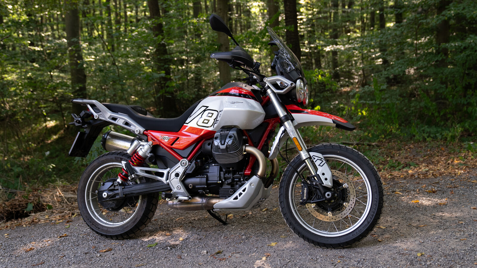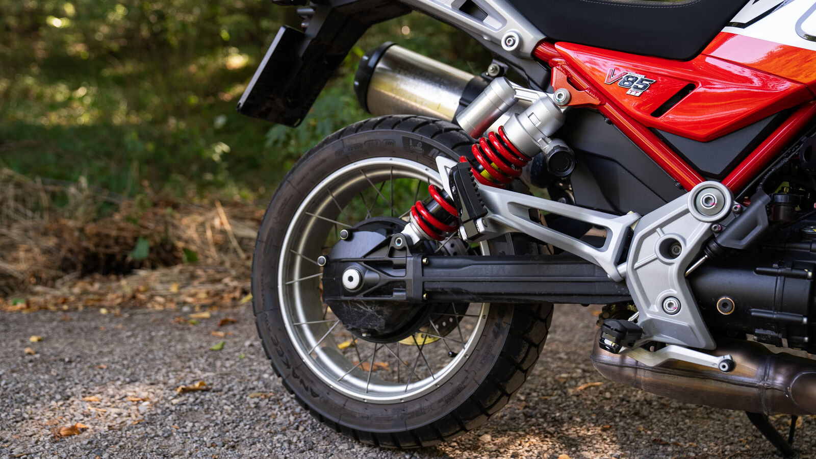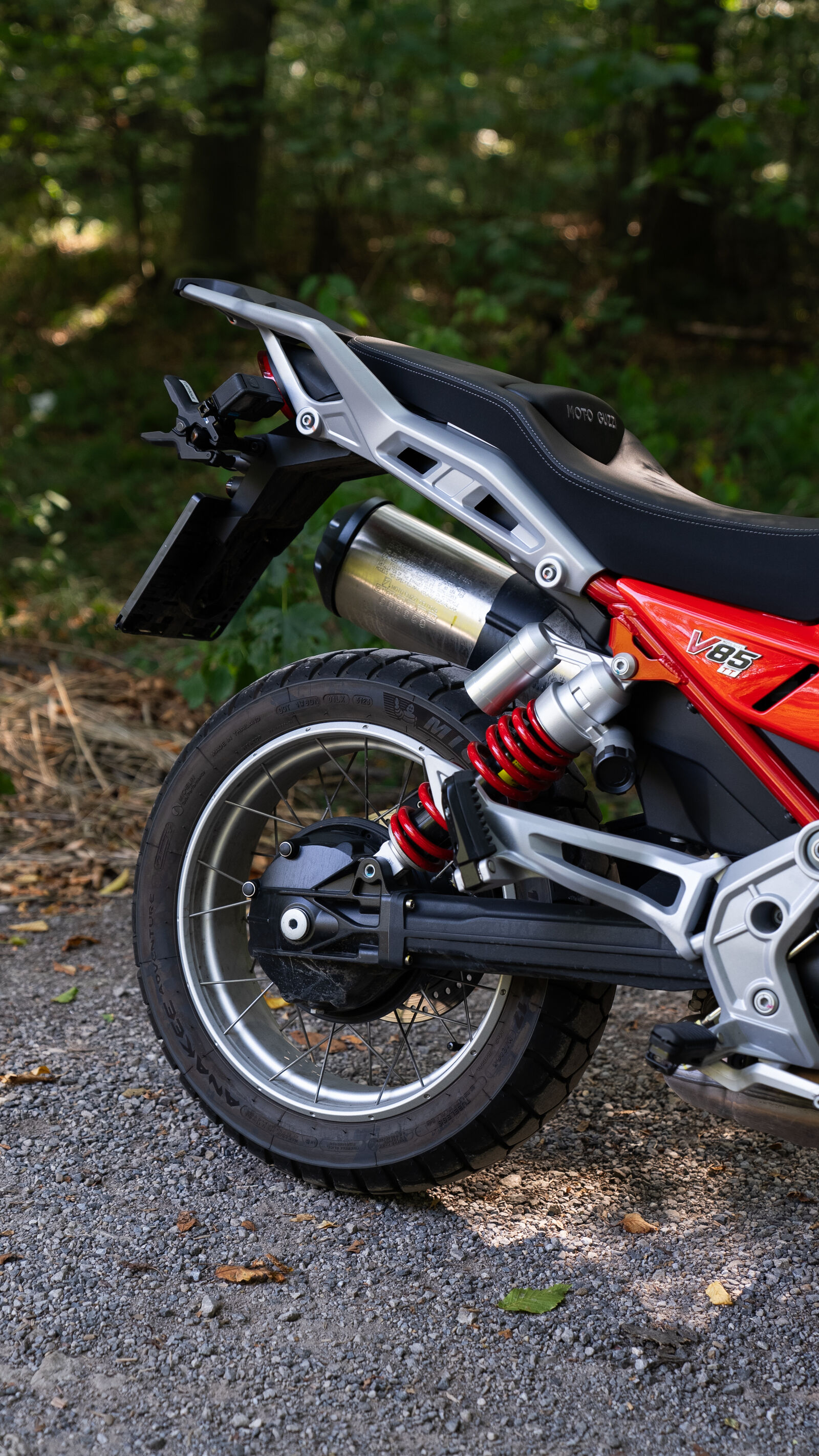 Das Fahrwerk der V 85 TT ist so konzipiert, dass es sowohl auf der Straße als auch abseits der befestigten Wege eine gute Figur macht. Mit einer 41-Millimeter-Upside-Down-Gabel und einem voll einstellbaren Federbein bietet die V 85 TT 170 Millimeter Federweg, was dir sowohl Komfort als auch Kontrolle beim Fahren auf Schotterpisten und Landstraßen gibt. Die 19-Zoll-Räder vorne und 17-Zoll-Räder hinten sorgen dafür, dass die V 85 TT spielerisch durch Kurven gleitet und auch unebene Oberflächen gut meistert. Wenn du also mal auf einen kleinen Schotterweg abbiegen möchtest, brauchst du dir keine Sorgen zu machen – die Moto Guzzi wird dir treu zur Seite stehen, als wäre sie dein bester Freund auf zwei Rädern.