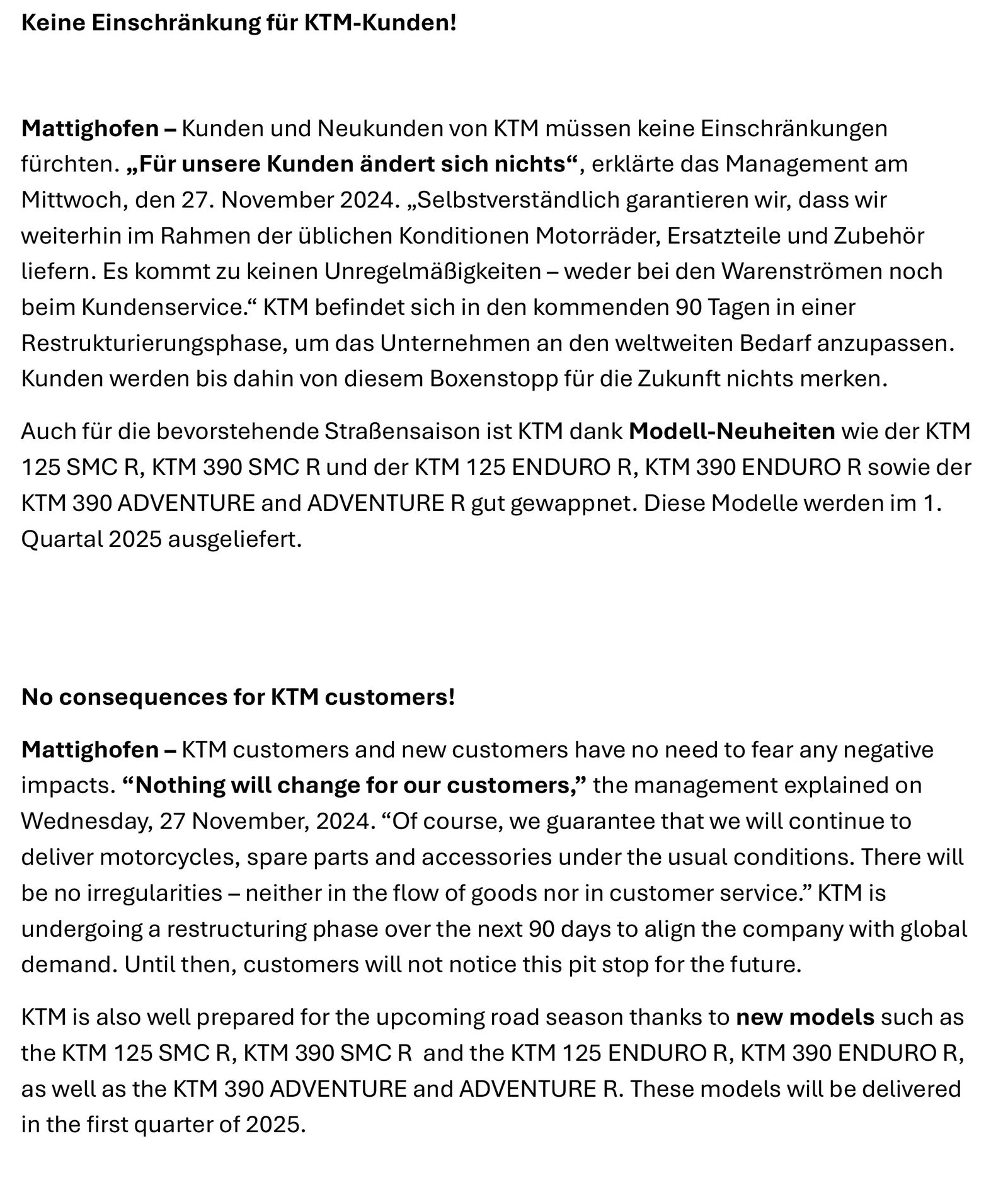 wir haben eine E-Mail aus Mattighofen erhalten mit der Bitte, das beigefügte offizielle Schreiben mit euch zu teilen. In diesem Statement geht es um eine klärende Mitteilung, um den aktuell verunsicherten Kunden im Markt Stabilität und Sicherheit zu vermitteln. Das KTM Management hat das beigefügte Statement erstellt, da aufgrund der derzeitigen Situation und den rechtlichen Vorgaben Handlungsbedarf besteht. Im nächsten Absatz findet ihr das Statement: