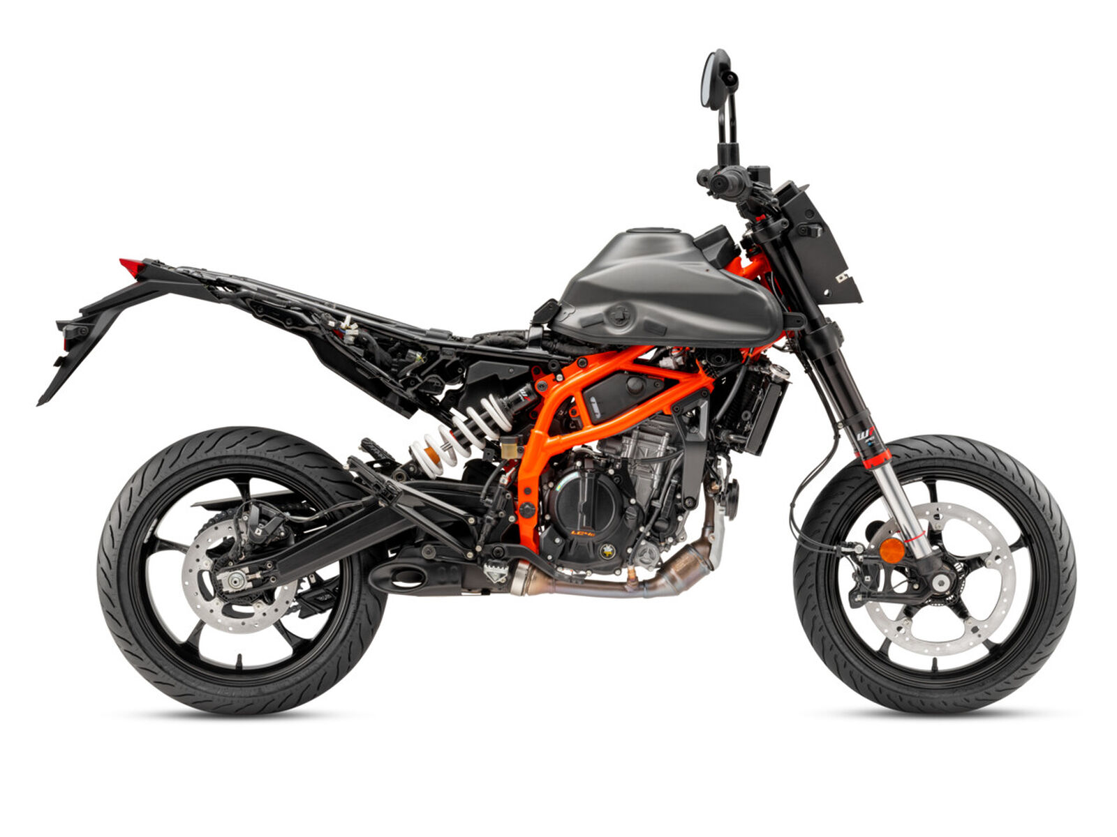 Die KTM 125 SMC R und KTM 390 SMC R verfügen über ein schlankes und kompaktes Körperprofil, dank eines sehr kompakten 9-Liter-Metalltanks und schmaler Verkleidungen. Diese reduzieren nicht nur die Gesamtbreite, sondern schützen auch den Tank im Falle eines Sturzes, während sie die Ergonomie des Fahrers beim Stehen auf den Fußrasten oder beim Einlenken in eine Kurve optimieren.