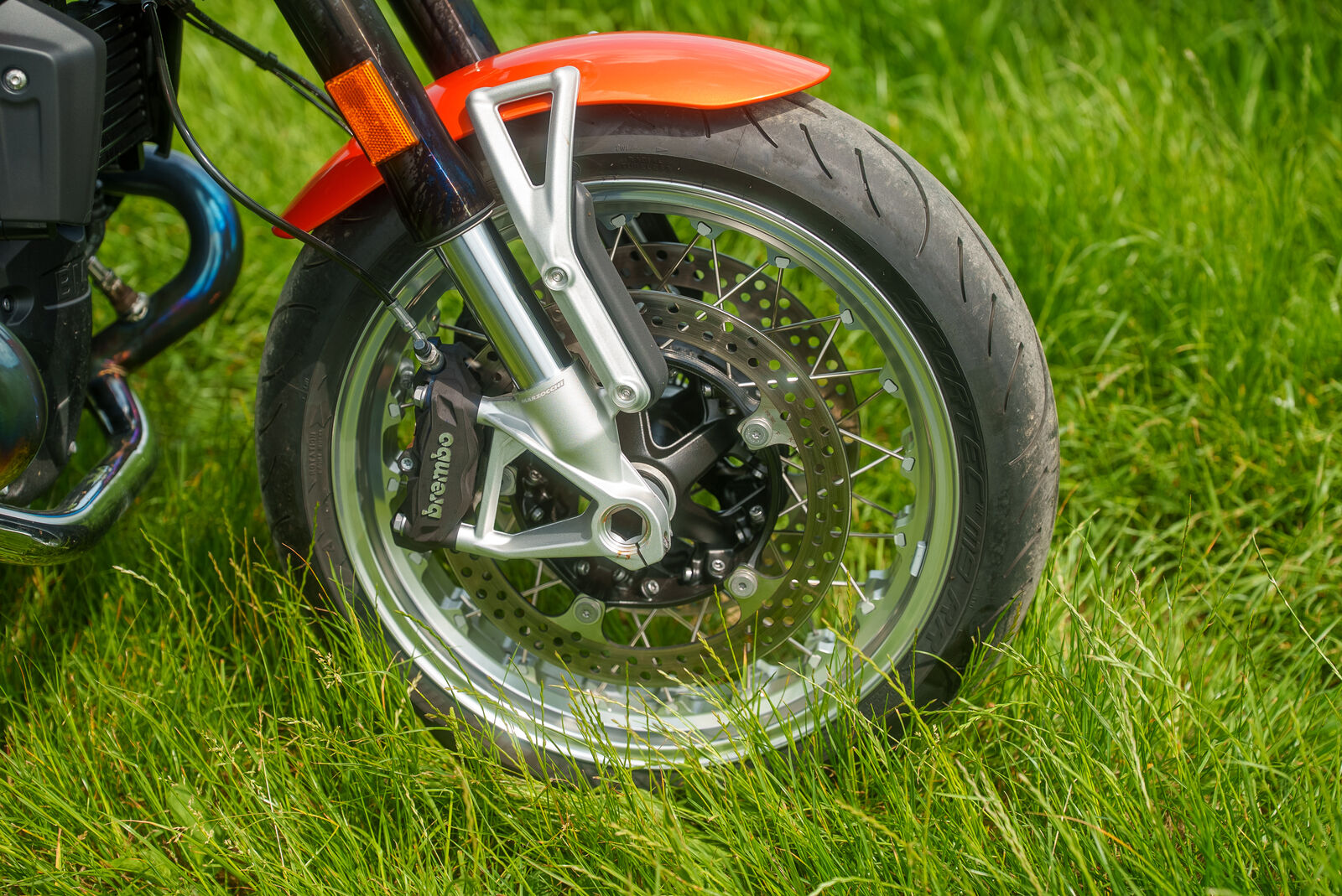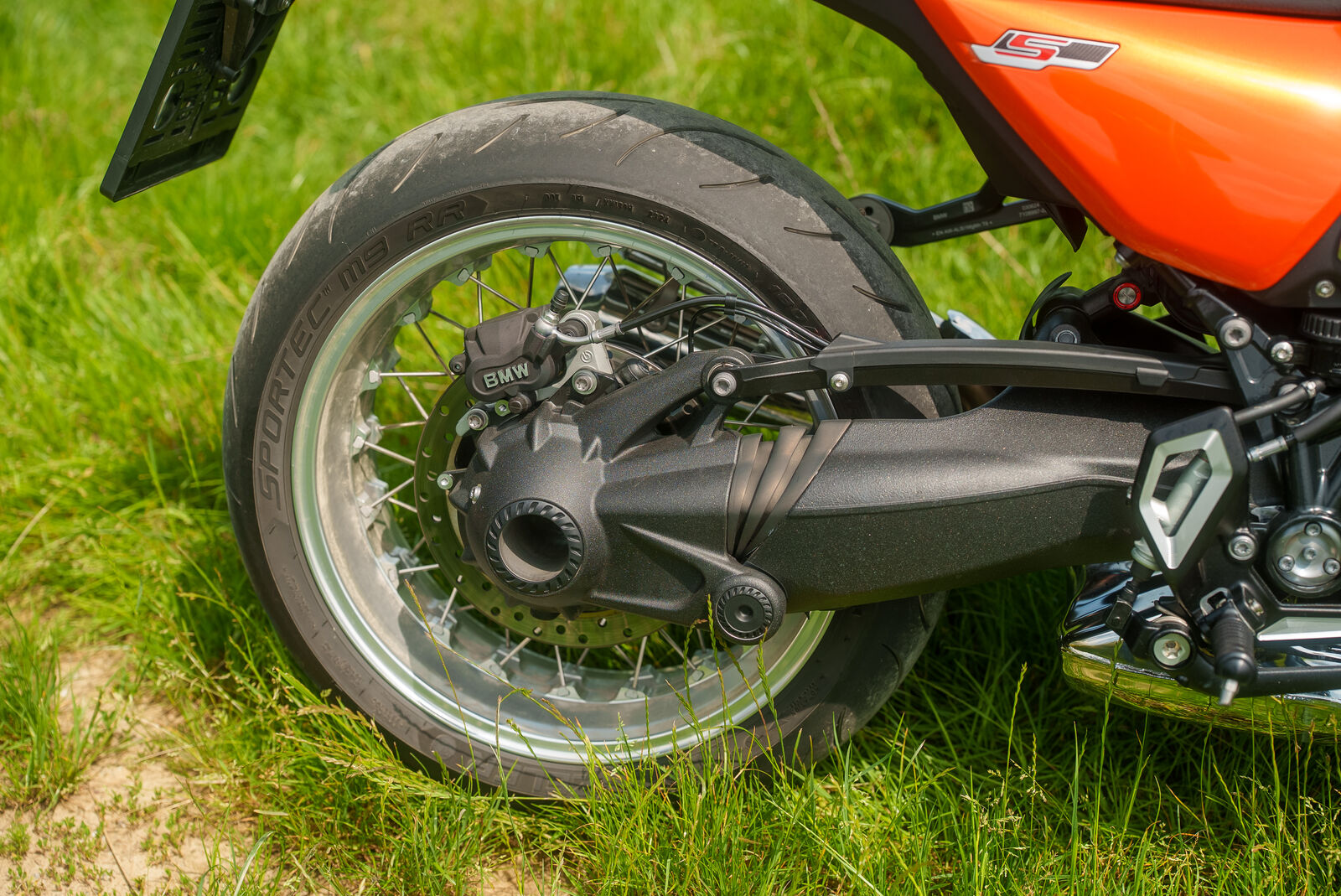 Das Fahrwerk der BMW R 12 S 2025 besteht aus einer 45 mm Upside-Down-Gabel vorne und einer Aluminiumguss-Einarmschwinge hinten, die beide voll einstellbar sind. Dies ermöglicht eine individuelle Anpassung an die Fahrbedingungen und sorgt für ein sportliches, gleichzeitig komfortables Fahrverhalten.