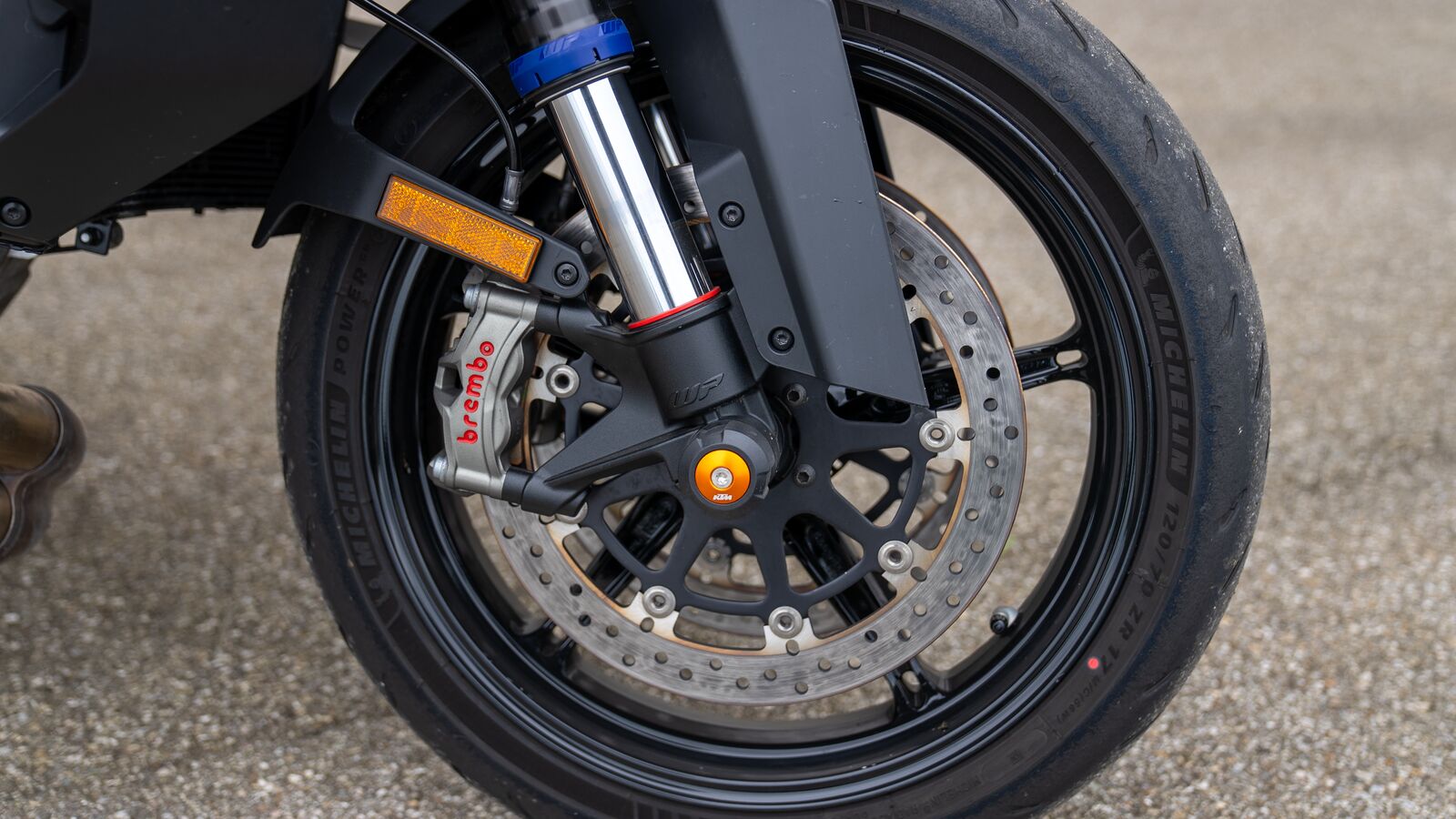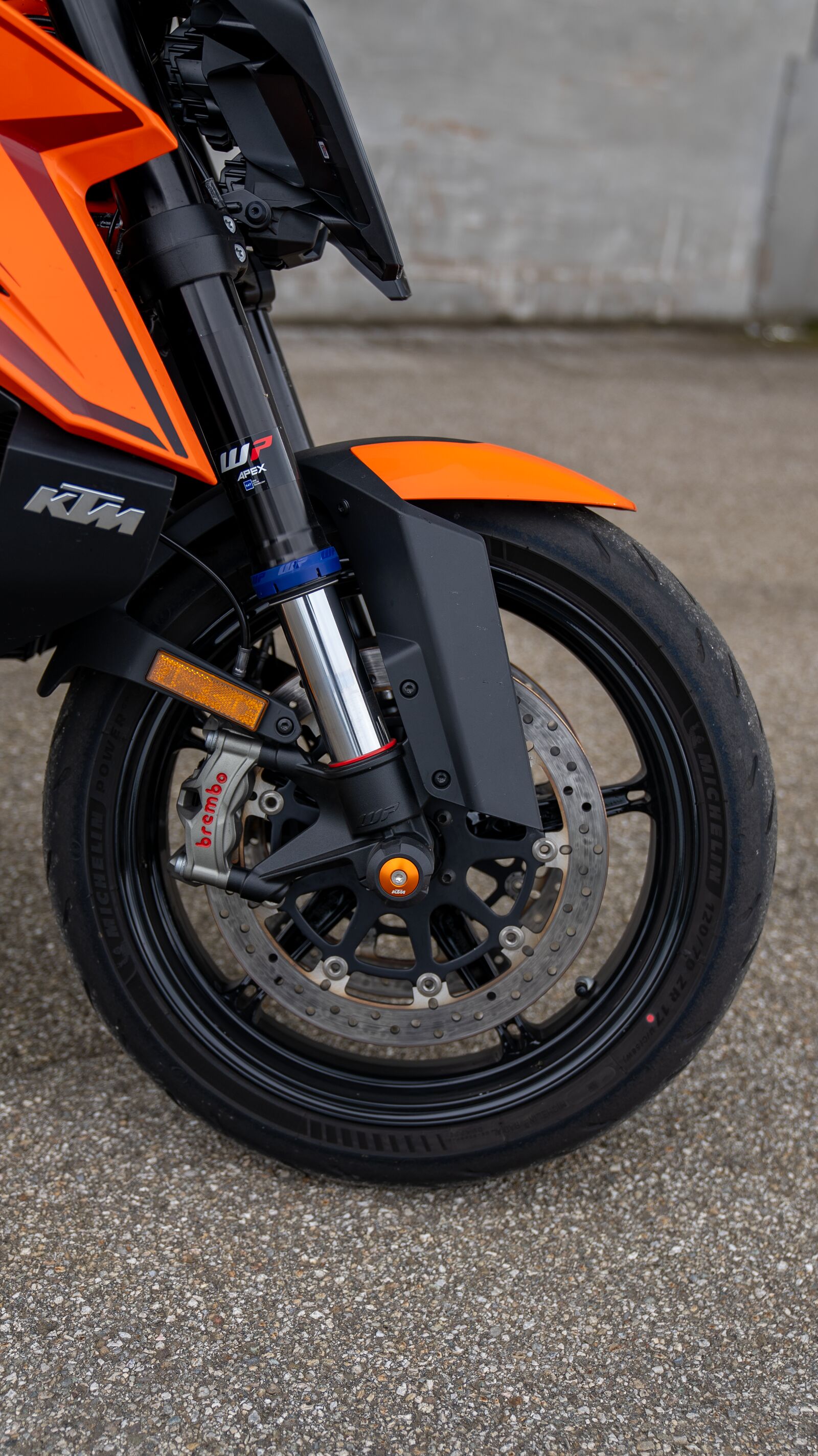 Die KTM Super Duke R 2024 verfügt über eine hochwertige 48 mm USD-Gabel vorne und ein Zentralfederbein hinten mit einem Federweg von 125 mm vorne und 140 mm hinten. Diese Konfiguration sorgt für exzellente Dämpfungseigenschaften und Stabilität, was ein präzises Handling und ein hervorragendes Fahrgefühl ermöglicht.