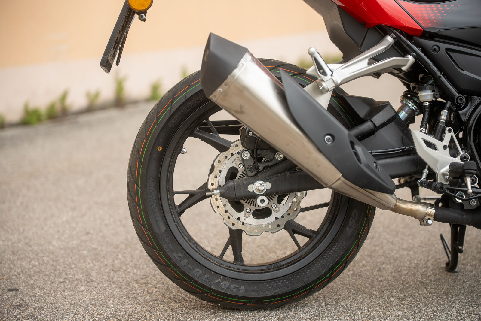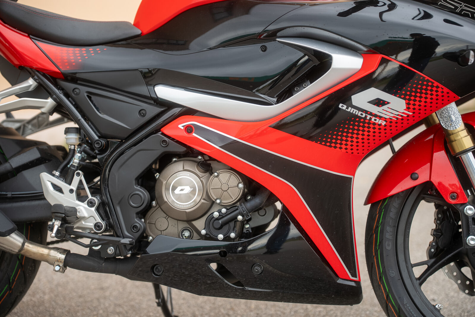 Die QJ Motor SRK 125 R 2025 ist mit CST-Reifen ausgestattet, die für die meisten Fahrbedingungen ausreichend Grip bieten. Trotz ihres preiswerten Segments wird empfohlen, auf qualitativ hochwertigere Reifen zu setzen, wenn man sportliches Fahren bevorzugt.