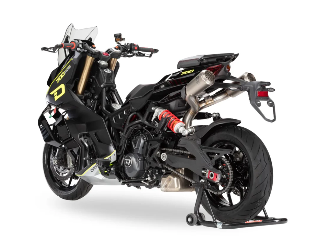 Das Fahrwerk des Italjet Dragster 700 Twin Premium Edition 2026 besteht aus einer voll einstellbaren Marzocchi Upside-Down-Gabel mit einem Durchmesser von 50 mm vorne und einem Marzocchi-Hinterrad-Monofederbein hinten. Diese hochwertige Ausstattung sorgt für hervorragende Dämpfungseigenschaften und Stabilität, was zu einem präzisen und sportlichen Fahrverhalten führt, sowohl in der Stadt als auch auf kurvigen Landstraßen.