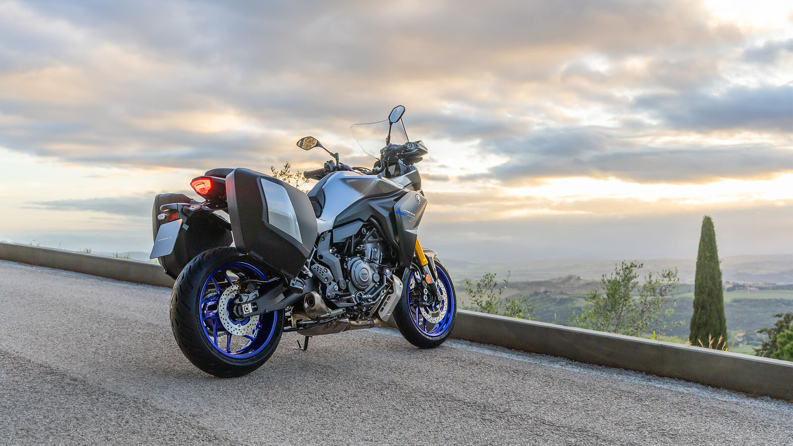 Die Yamaha Tracer 7 GT 2025 hat die Abmessungen 2135 x 875 x 1424 mm. Diese Größe sorgt für ein ausgewogenes Handling und eine stabile Straßenlage, während der 1495 mm lange Radstand für zusätzliche Stabilität bei höheren Geschwindigkeiten sorgt.